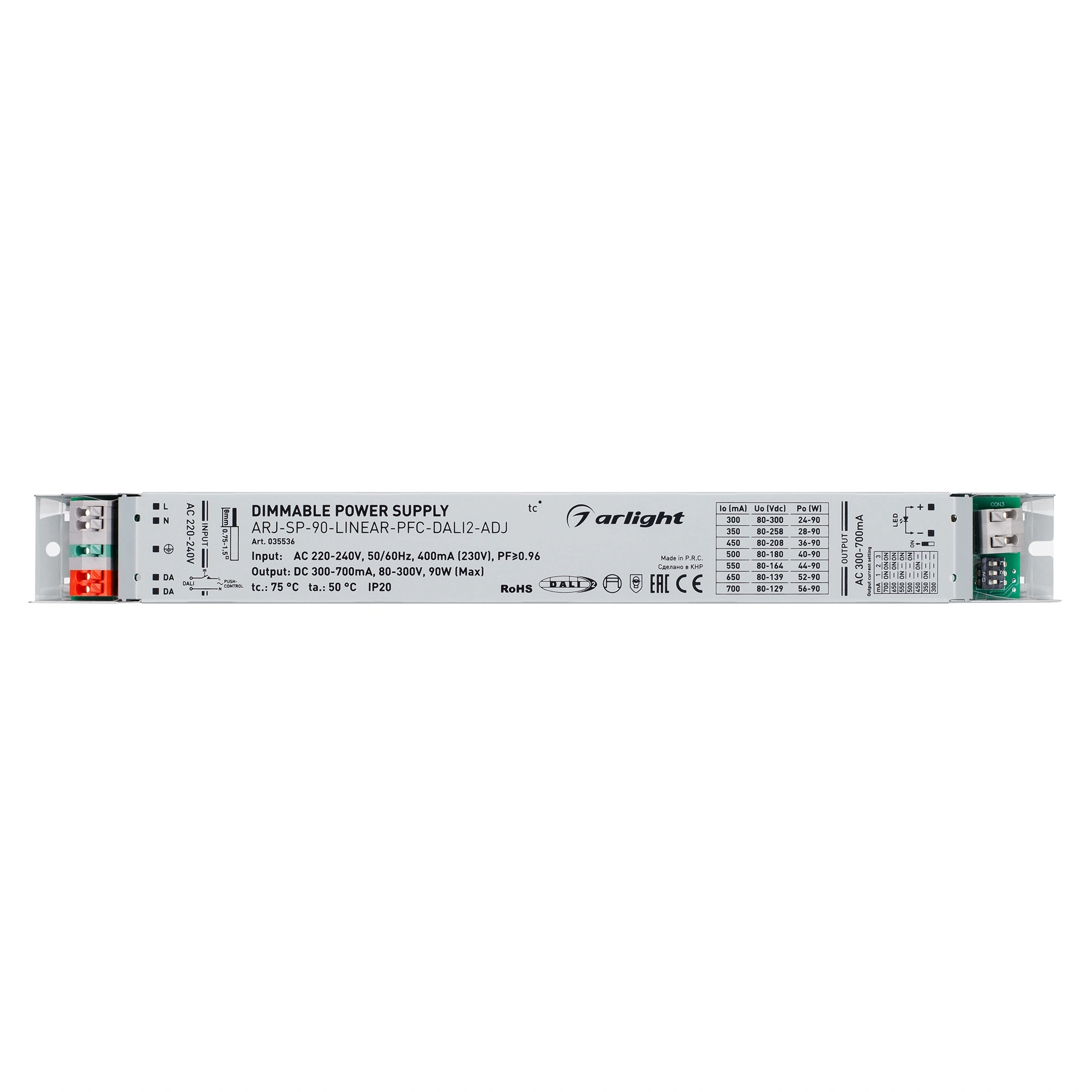 Диммируемый источник тока без гальванической развязки с регулировкой для светильников и мощных светодиодов. Входное напряжение 220-240 VAC. Предназначены для питания групп светильников и светодиодов от одного источника тока. Выходные параметры: 80-300В (300мА), 80-258В (350мА), 80-208В (450мА), 80-180В (500мА), 80-164В (550мА), 80-139В (650мА), 80-129В (700мА), максимальная мощность 90 Вт. Встроенный PFC >0,96. Негерметичный металлический корпус IP 20. Габаритные размеры длина 284 мм, ширина 30 мм, высота 20 мм. Гарантийный срок 5 лет.