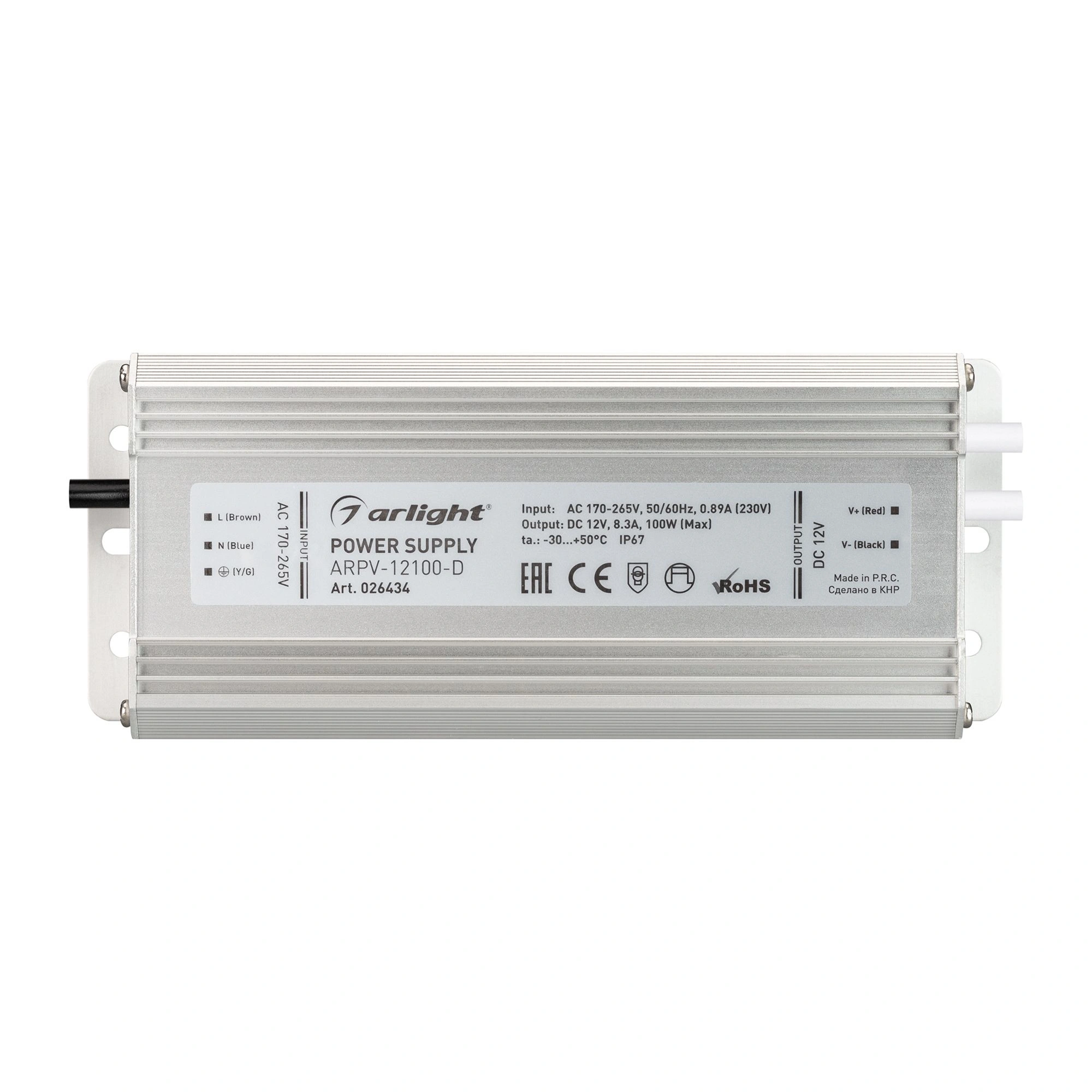 Источник напряжения с гальванической развязкой для светодиодных изделий. Входное напряжение 170-265 VAC. Выходные параметры: 12 В, 8,3 А, 100 Вт. Встроенный PFC >0,5. Герметичный алюминиевый корпус IP 67. Рабочая температура -30…+50C⁰. Габаритные размеры длина 178 мм, ширина 71 мм, высота 46 мм. Гарантийный срок 3 года.