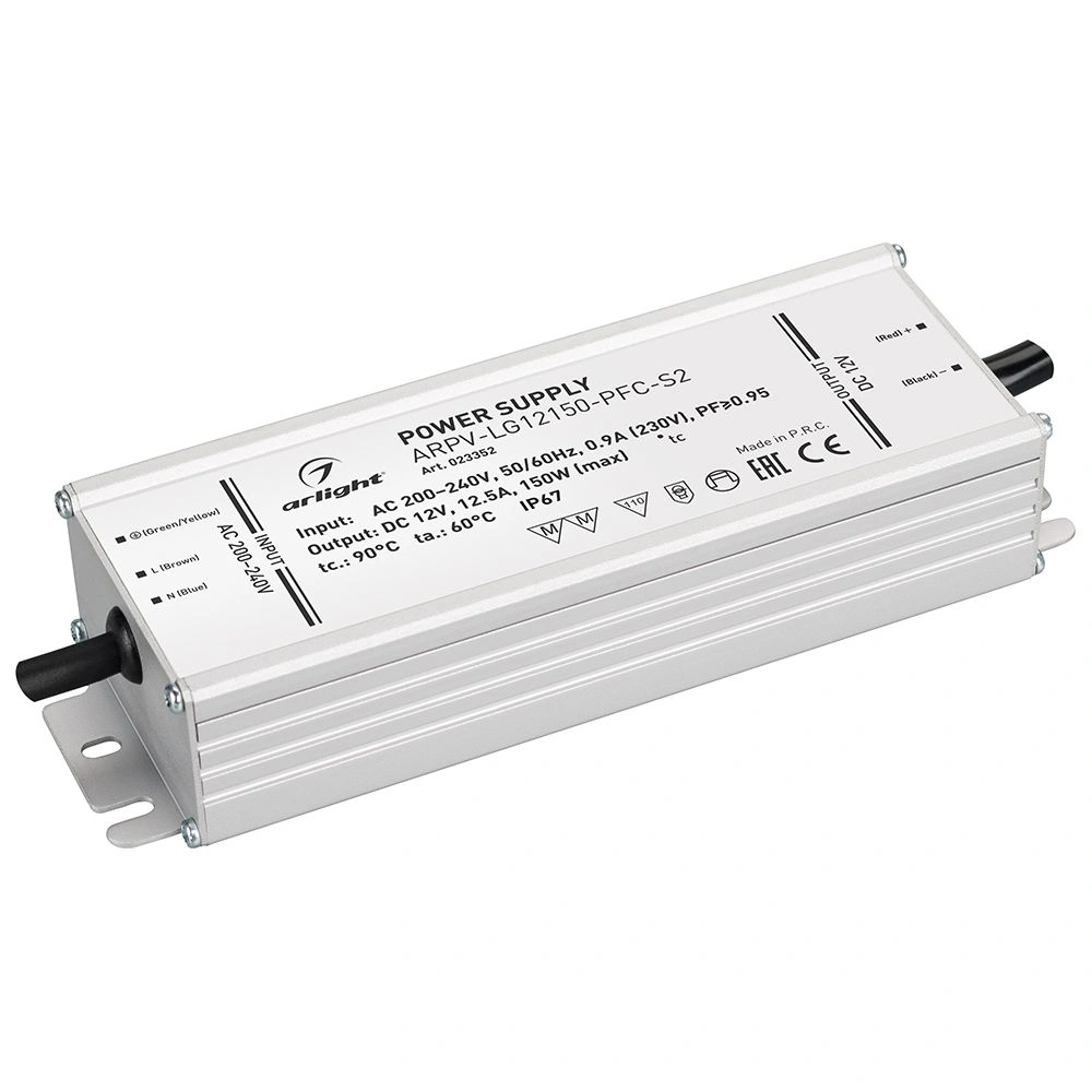 Источник напряжения с гальванической развязкой для светодиодных изделий. Входное напряжение 200-240 VAC. Выходные параметры: 12 В, 12.5 А, 150 Вт. Встроенный PFC >0,95. Герметичный алюминиевый корпус IP 67. Рабочая температура -40…+60C⁰. Габаритные размеры длина 190 мм, ширина 61 мм, высота 36 мм. Гарантийный срок 5 лет.
