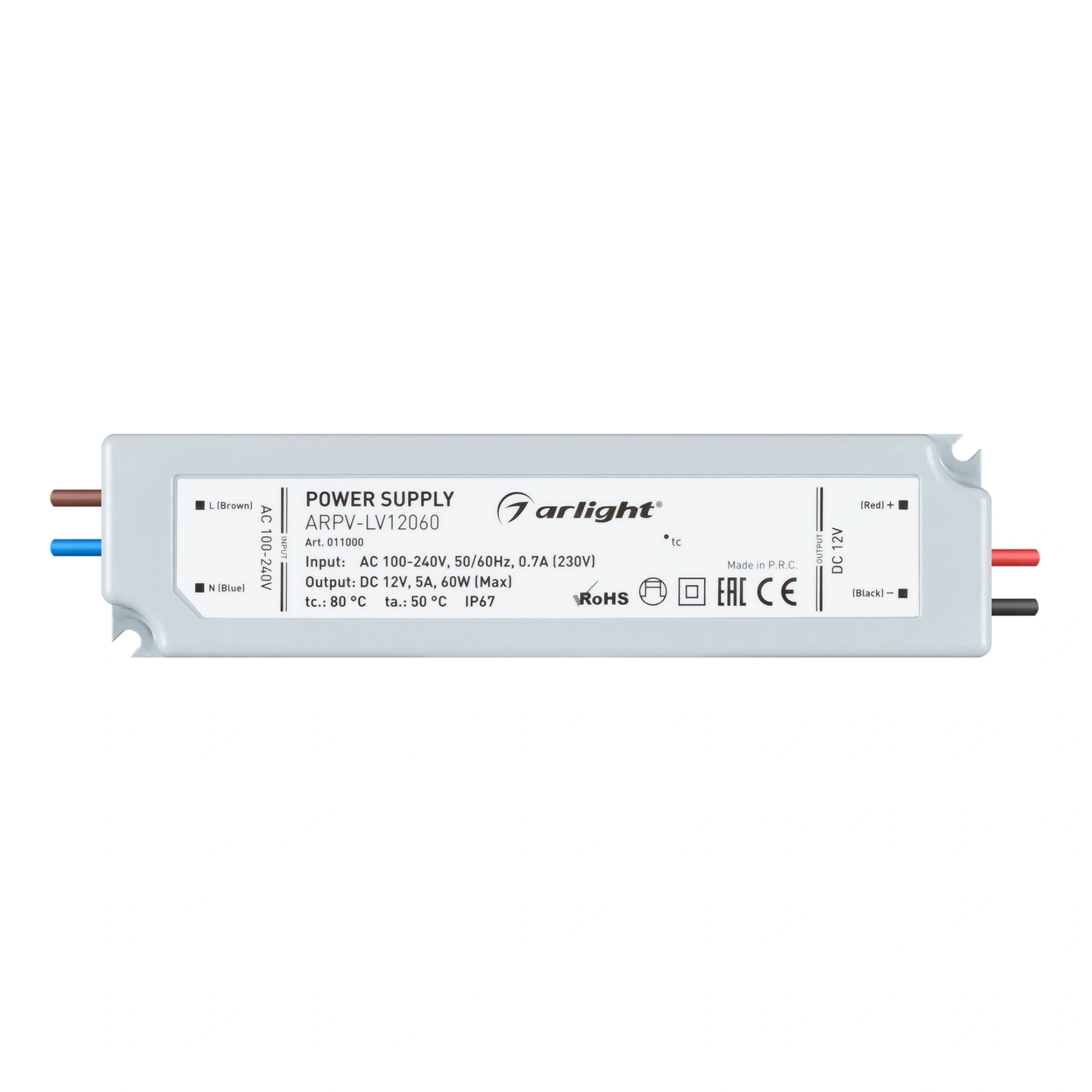 Источник напряжения с гальванической развязкой для светодиодных изделий. Входное напряжение 100-240 VAC. Выходные параметры: 12 В, 5 А, 60 Вт. Встроенный PFC >0,5. Герметичный пластиковый корпус IP 67. Рабочая температура -20…+50C⁰. Габаритные размеры длина 162 мм, ширина 42 мм, высота 34 мм. Гарантийный срок 2 года.
