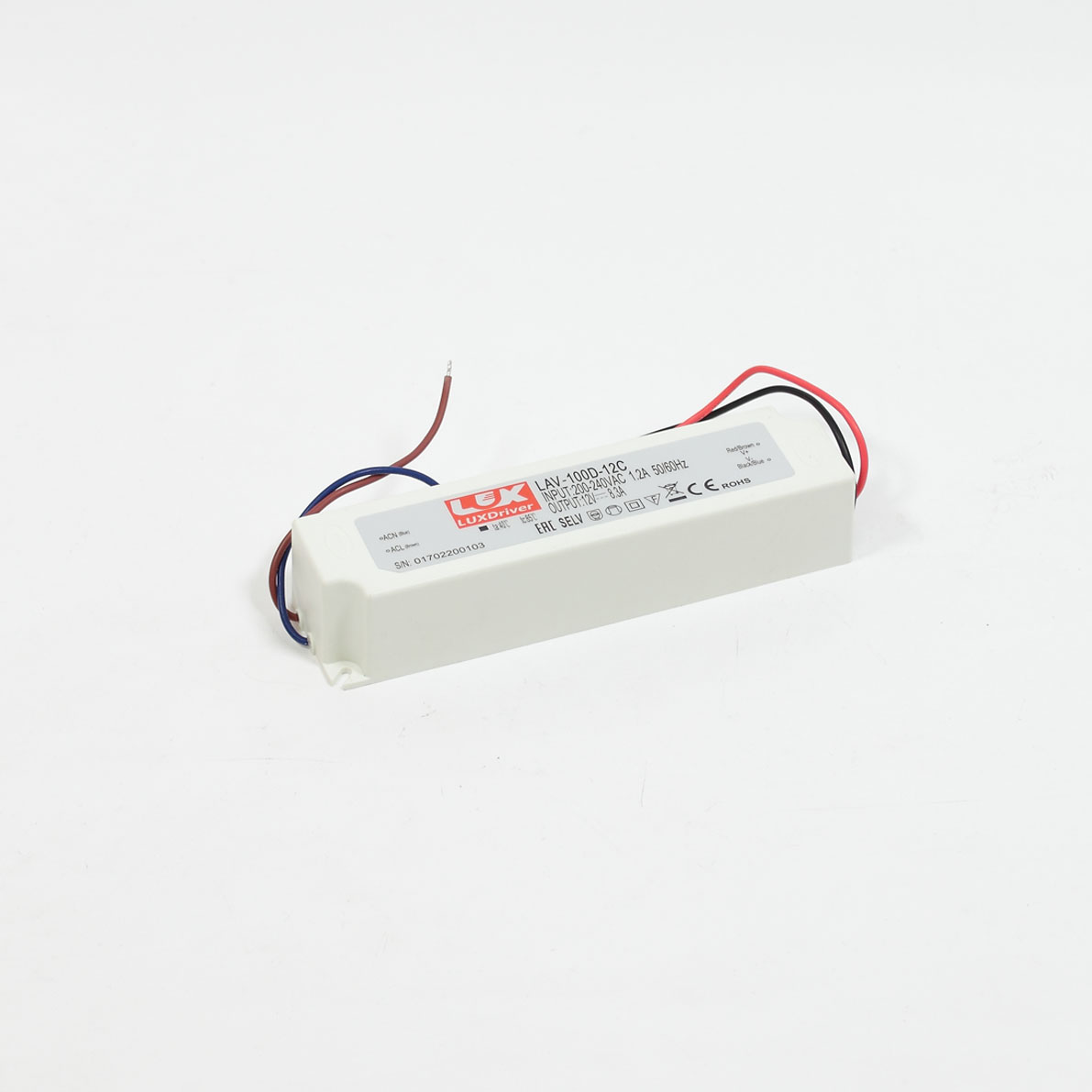 Источник стабилизированного напряжения 12V 100W 8.3A. В пластиковом корпусе. Степень защиты IP67. Входное напряжение 200-240V, выходное напряжение 12V. Размеры 167x42x34мм. Вес 415г. Гарантия 2 года.