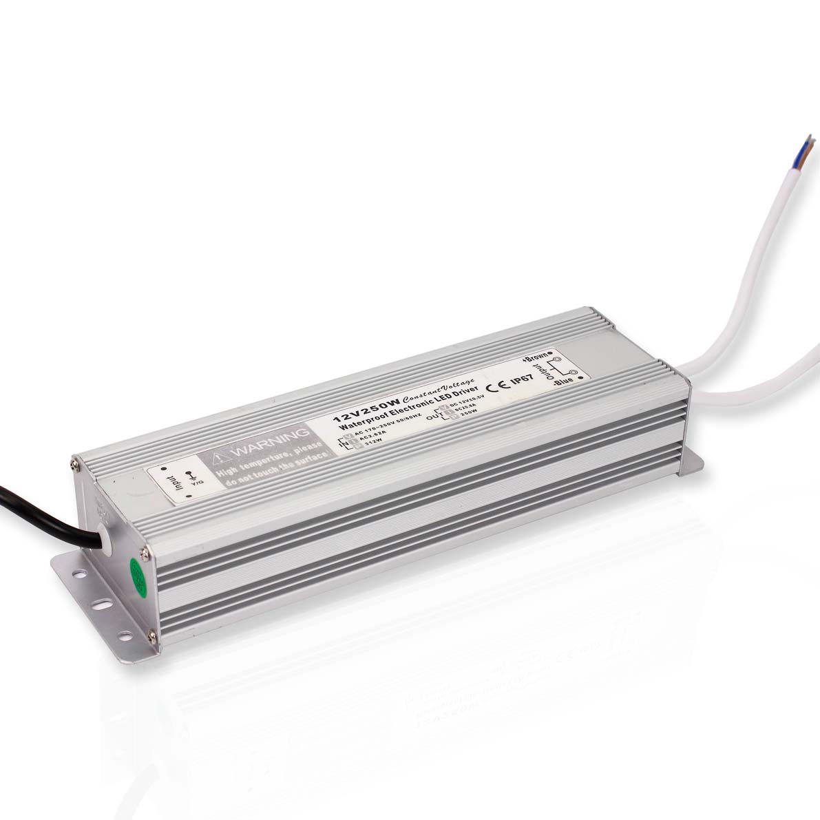 Блок питания 12V 250W 20,8A. Герметичный металлический корпус. Степень защиты IP67. Входное напряжение 170-250V , выходное напряжение 12V.Размеры 245x68x43мм. Вес 1200г.