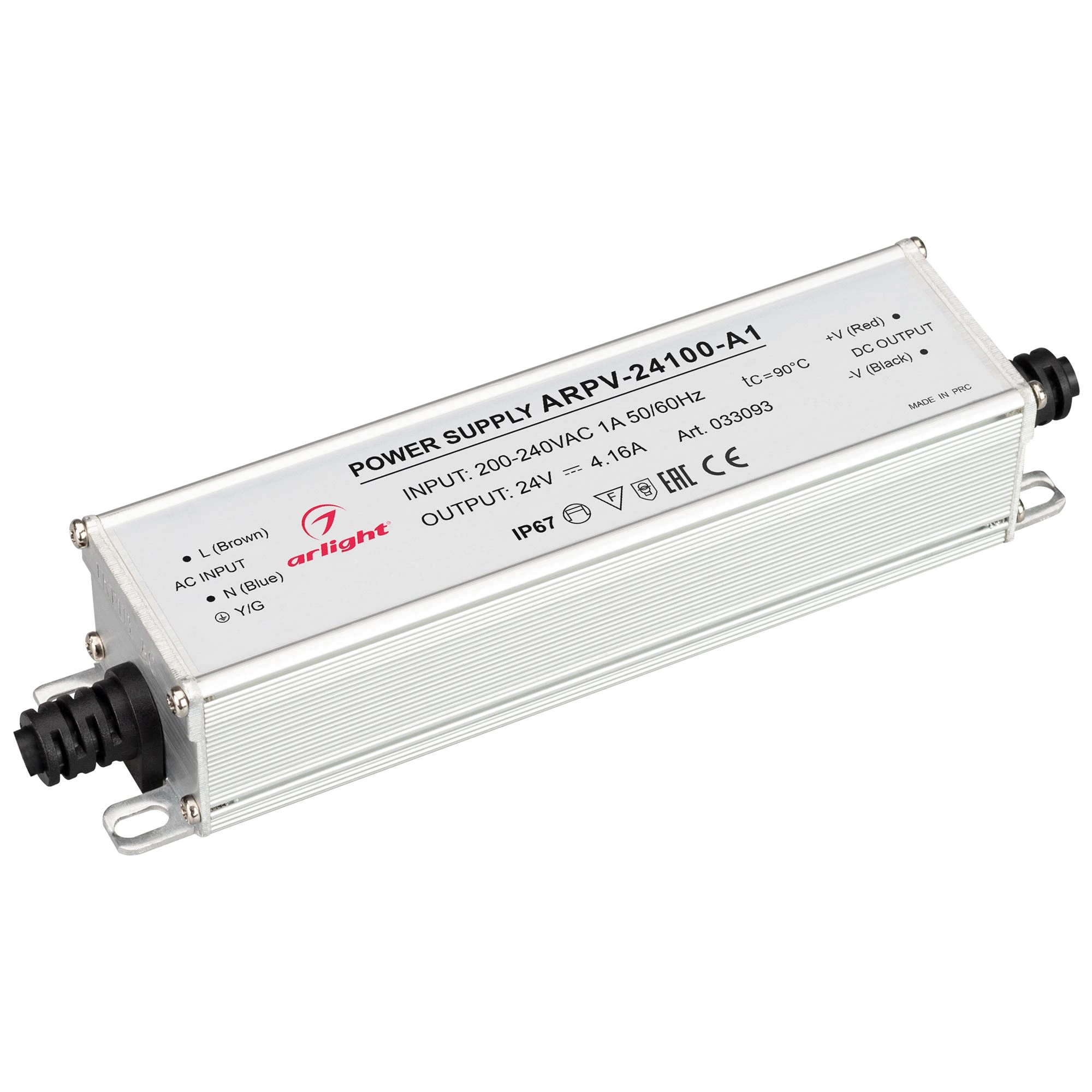 Источник напряжения с гальванической развязкой для светодиодных изделий. Входное напряжение 200-240 VAC. Выходные параметры: 24 В, 4.16 А, 100 Вт. Встроенный PFC >0.5. Герметичный алюминиевый корпус IP 67. Рабочая температура -40…+70C⁰. Габаритные размеры длина 152 мм, ширина 37.5 мм, высота 31 мм. Гарантийный срок 3 года.