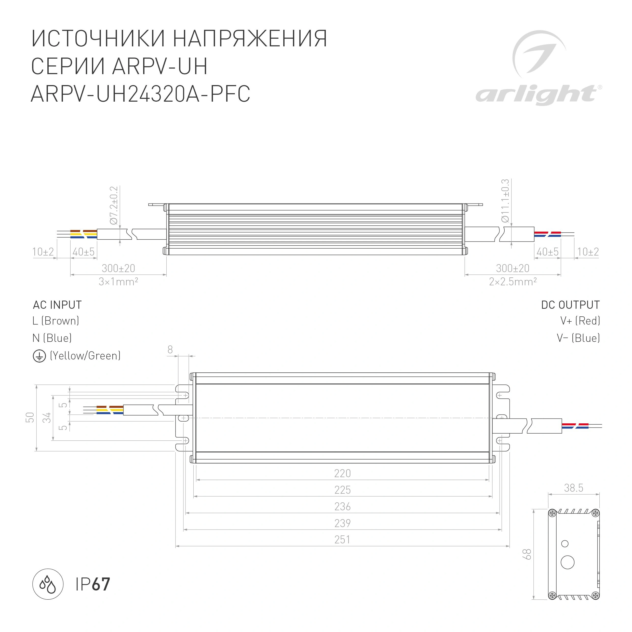 Источник напряжения с гальванической развязкой для светодиодных изделий. Входное напряжение 120-240 VAC. Выходные параметры: 24 В, 13,3 А, 320 Вт. Встроенный PFC >0,95. Герметичный алюминиевый корпус IP 67. Рабочая температура -40…+70C⁰. Габаритные размеры длина 251 мм, ширина 67.5 мм, высота 38.5 мм. Гарантийный срок 7 лет.