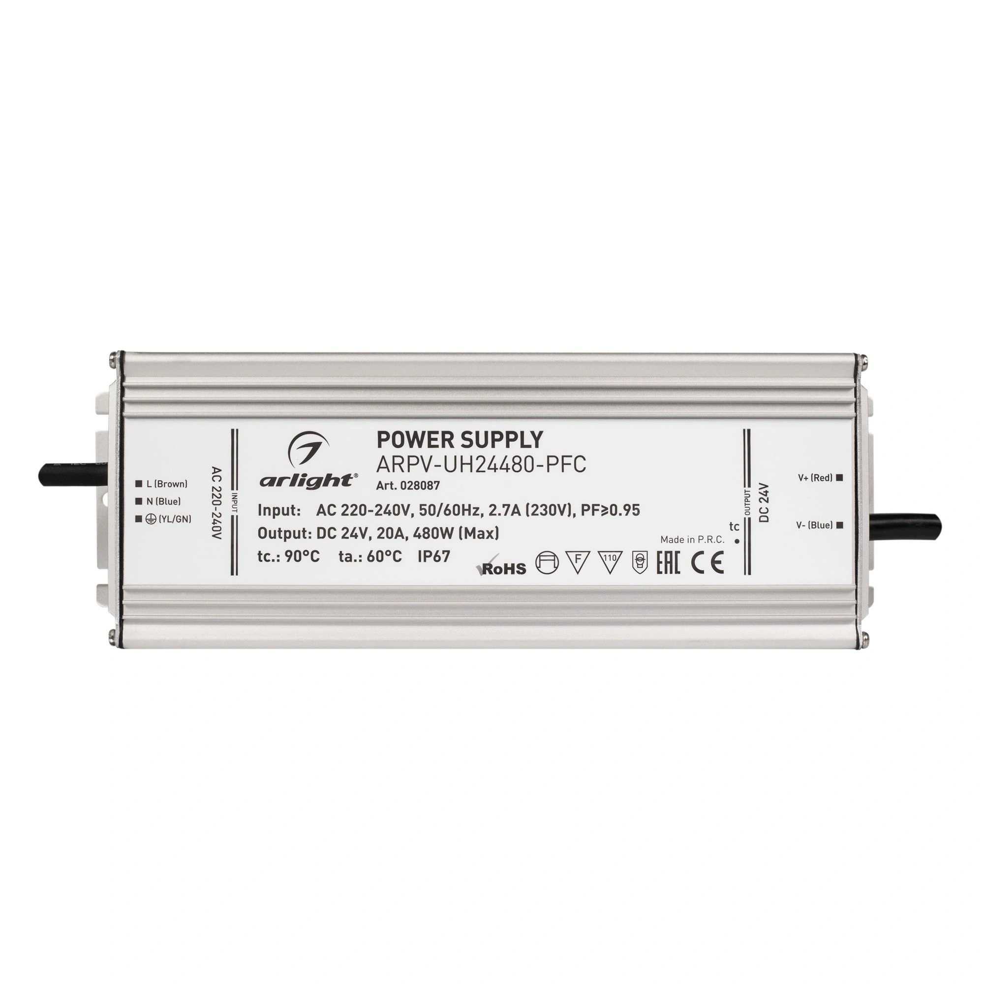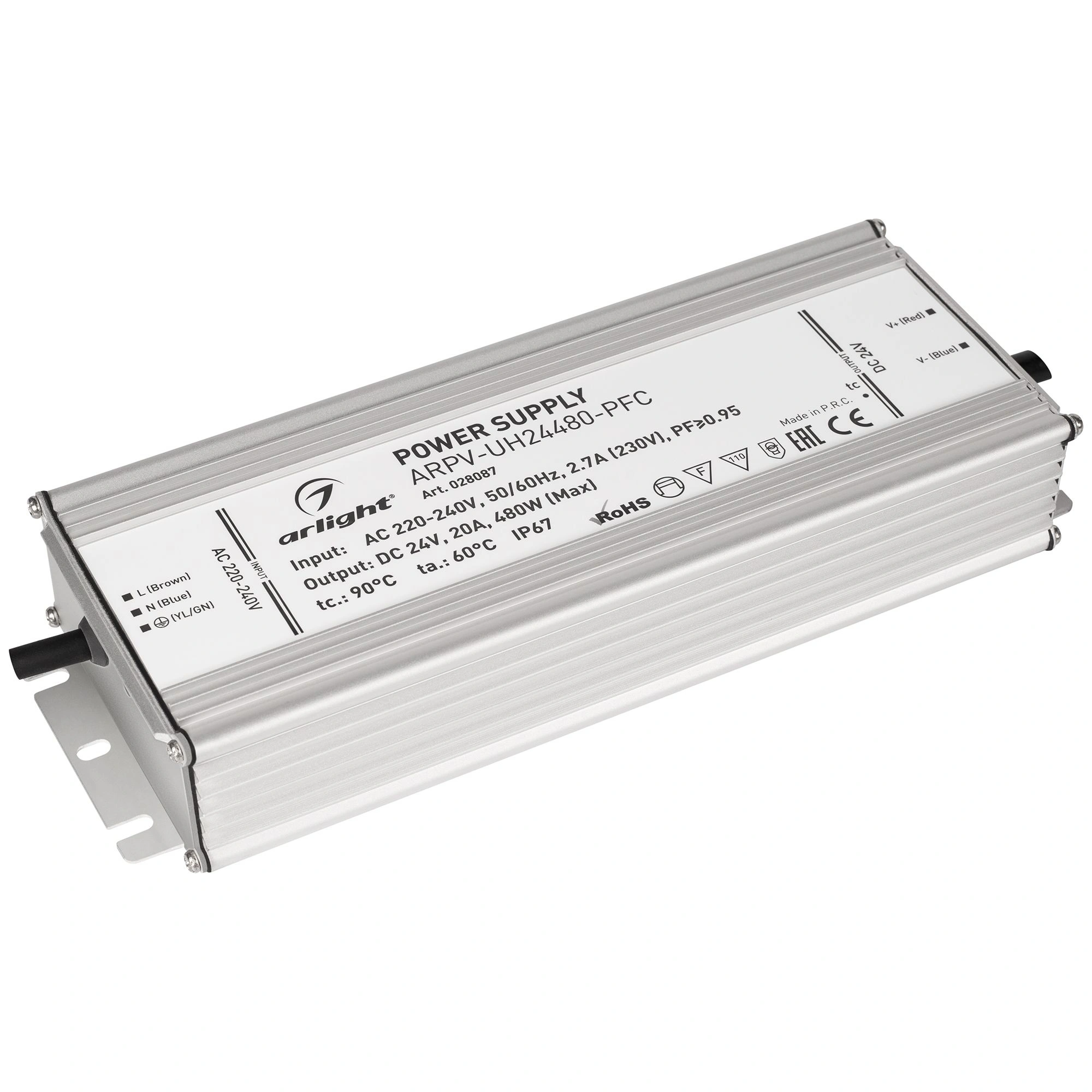 Источник напряжения с гальванической развязкой для светодиодных изделий. Входное напряжение 220-240 VAC. Выходные параметры: 24 В, 20 А, 480 Вт. Встроенный PFC >0,95. Герметичный алюминиевый корпус IP 67. Рабочая температура -40…+70C⁰. Габаритные размеры длина 251 мм, ширина 90 мм, высота 41.5 мм. Гарантийный срок 7 лет.