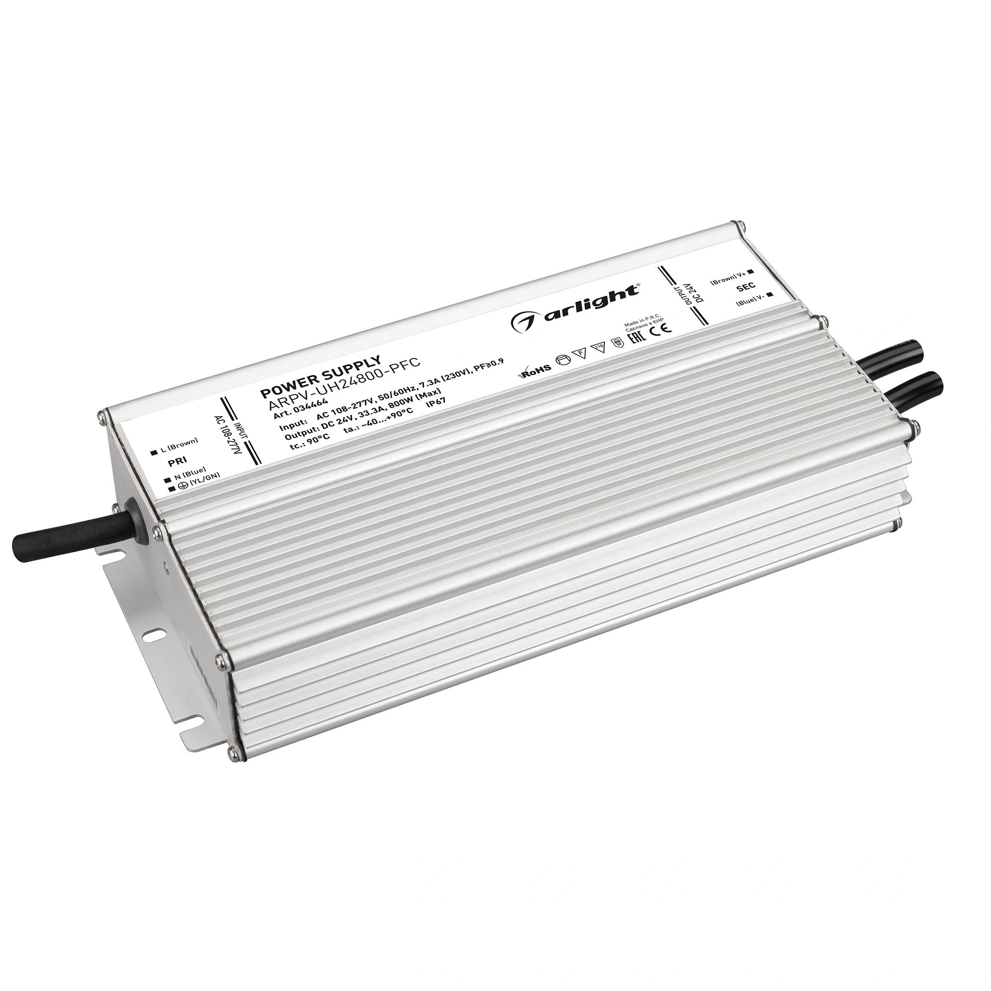 Источник напряжения с гальванической развязкой для светодиодных изделий. Входное напряжение 108-277 VAC. Выходные параметры: 24 В, 33.3 А, 800 Вт. Встроенный PFC >0.9. Герметичный алюминиевый корпус IP 67. Рабочая температура -40…+90C⁰. Габаритные размеры длина 262 мм, ширина 125 мм, высота 49 мм. Гарантийный срок 7 лет.