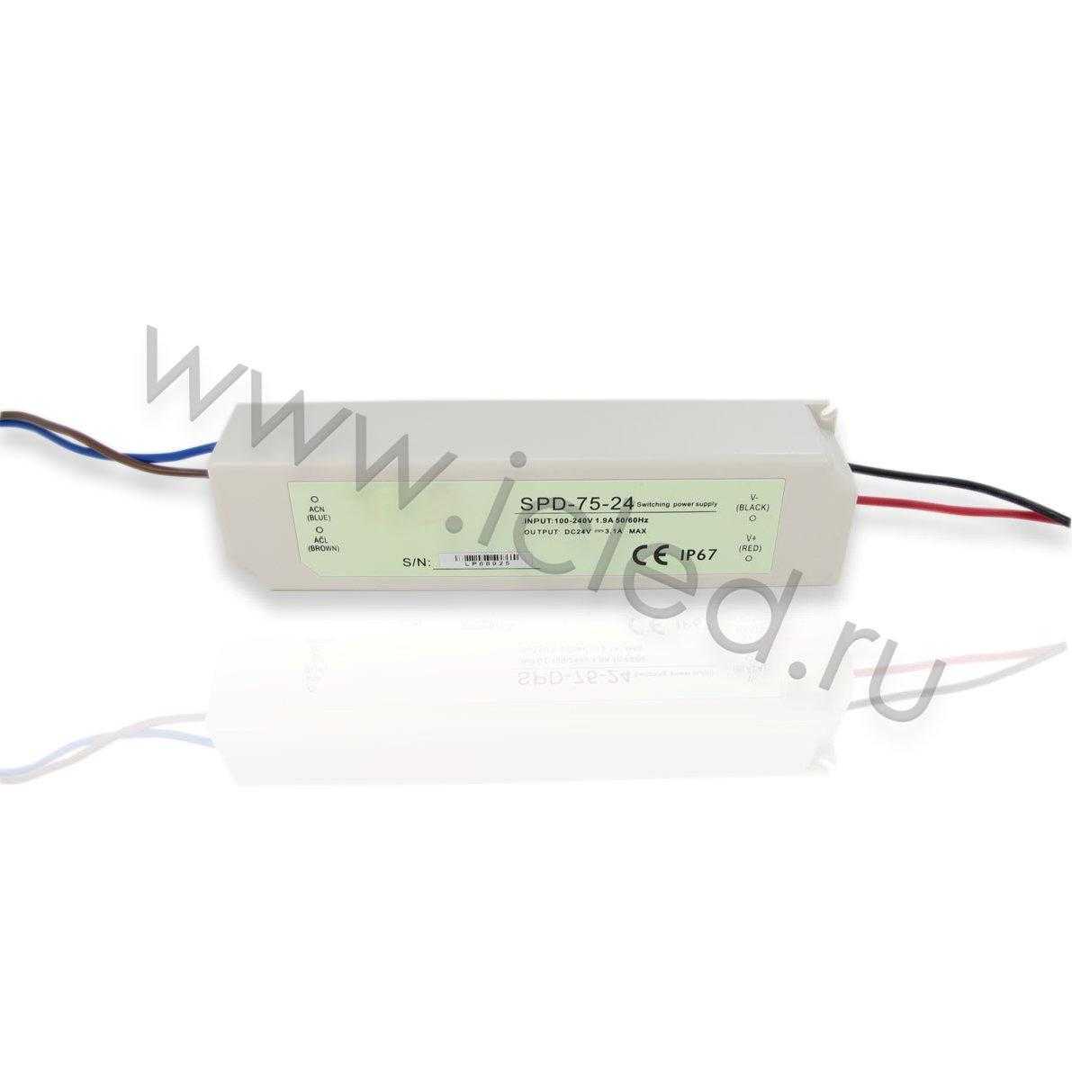 Блок питания 24V 75W 3,1A. Белый герметичный пластиковый корпус. Степень защиты IP67. Входное напряжение 85-265V, выходное напряжение 24V. Производитель SANPU. Размеры 175x45x32мм.