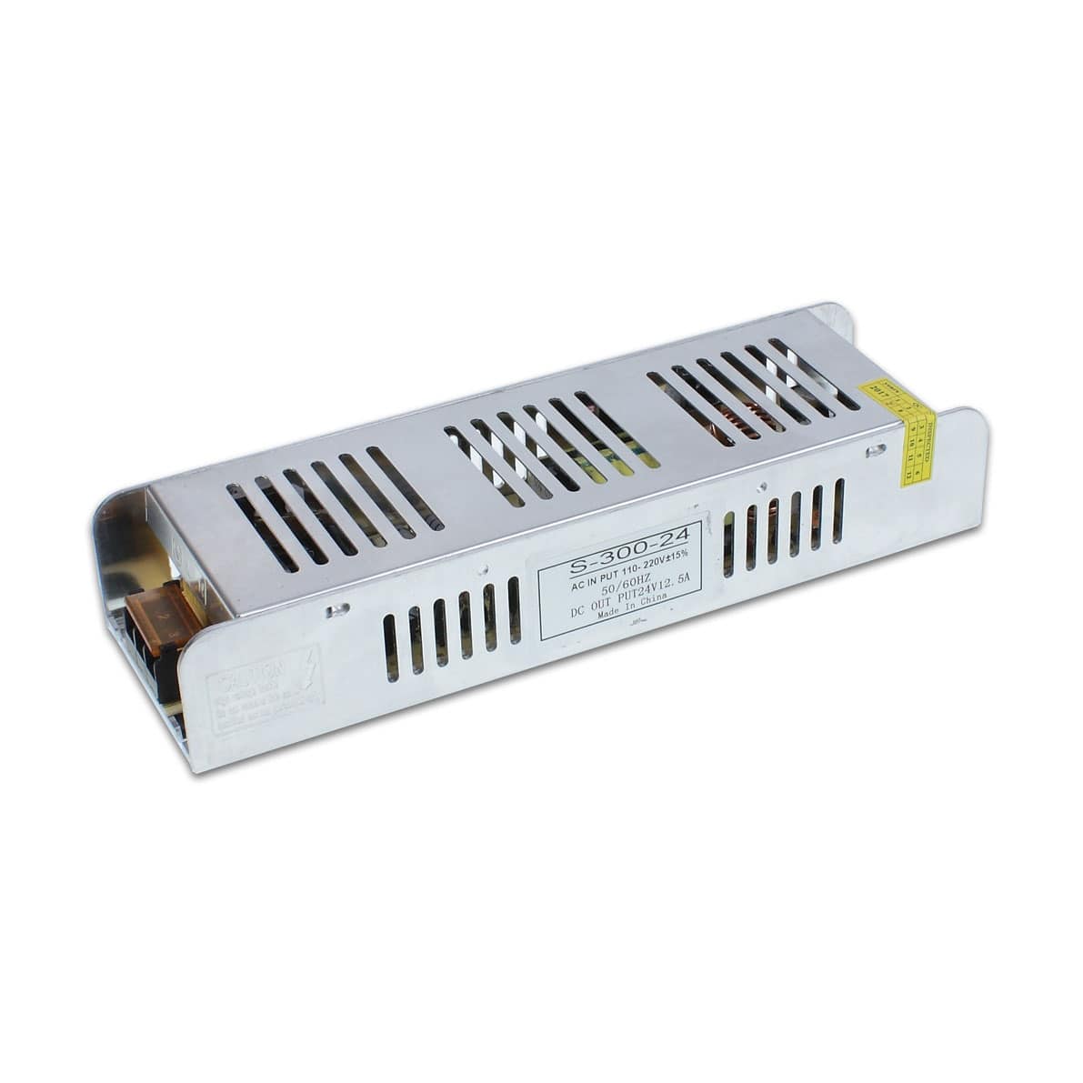 Блок питания S-24-300. 24V, 300W, 12.5A. В защитном кожухе. Степень защиты IP20. Входное напряжение 110-220V, выходное напряжение 24V. Размеры 223x67x40mm. Вес 420г.