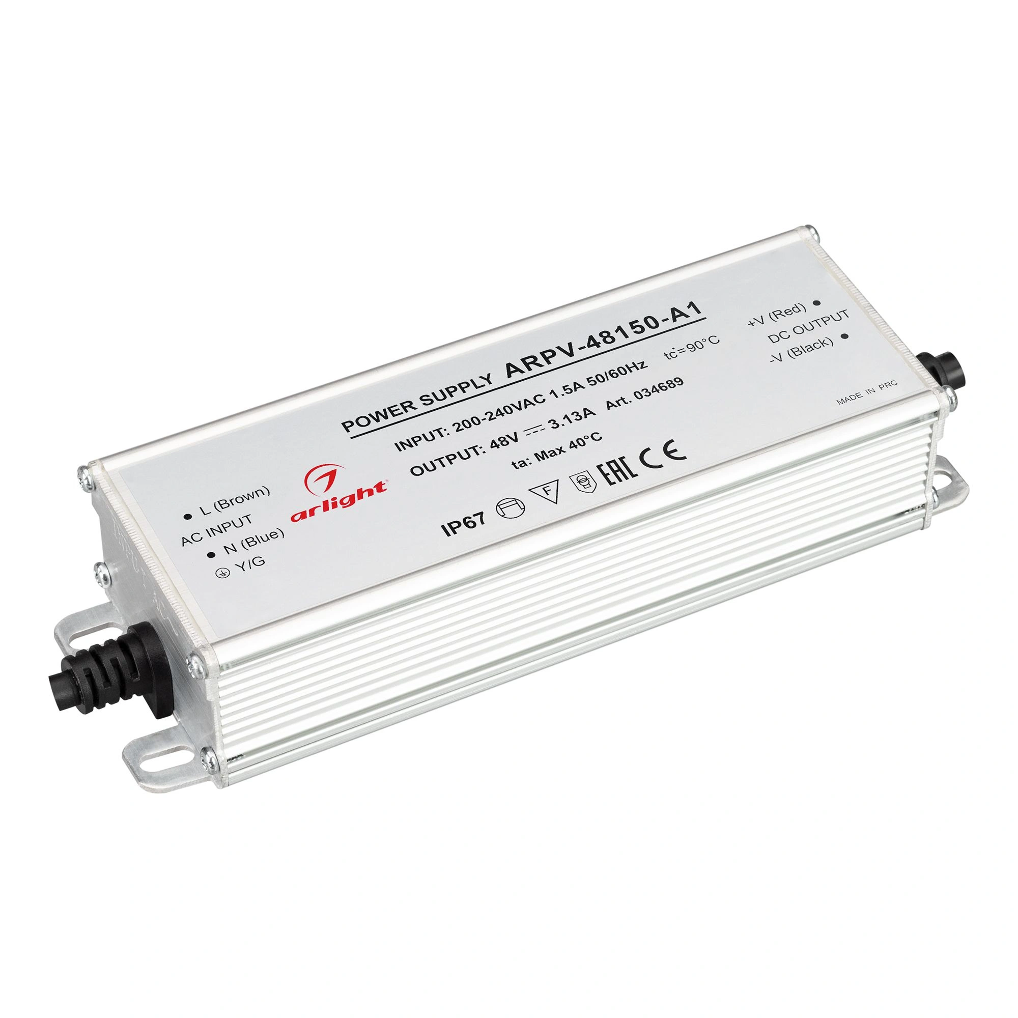 Источник напряжения с гальванической развязкой для светодиодных изделий. Входное напряжение 200-240 VAC. Выходные параметры: 48 В, 3.13 А, 150 Вт. Встроенный PFC >0.5. Герметичный алюминиевый корпус IP 67. Рабочая температура -40…+70C⁰. Габаритные размеры длина 174 мм, ширина 56 мм, высота 36 мм. Гарантийный срок 3 года.