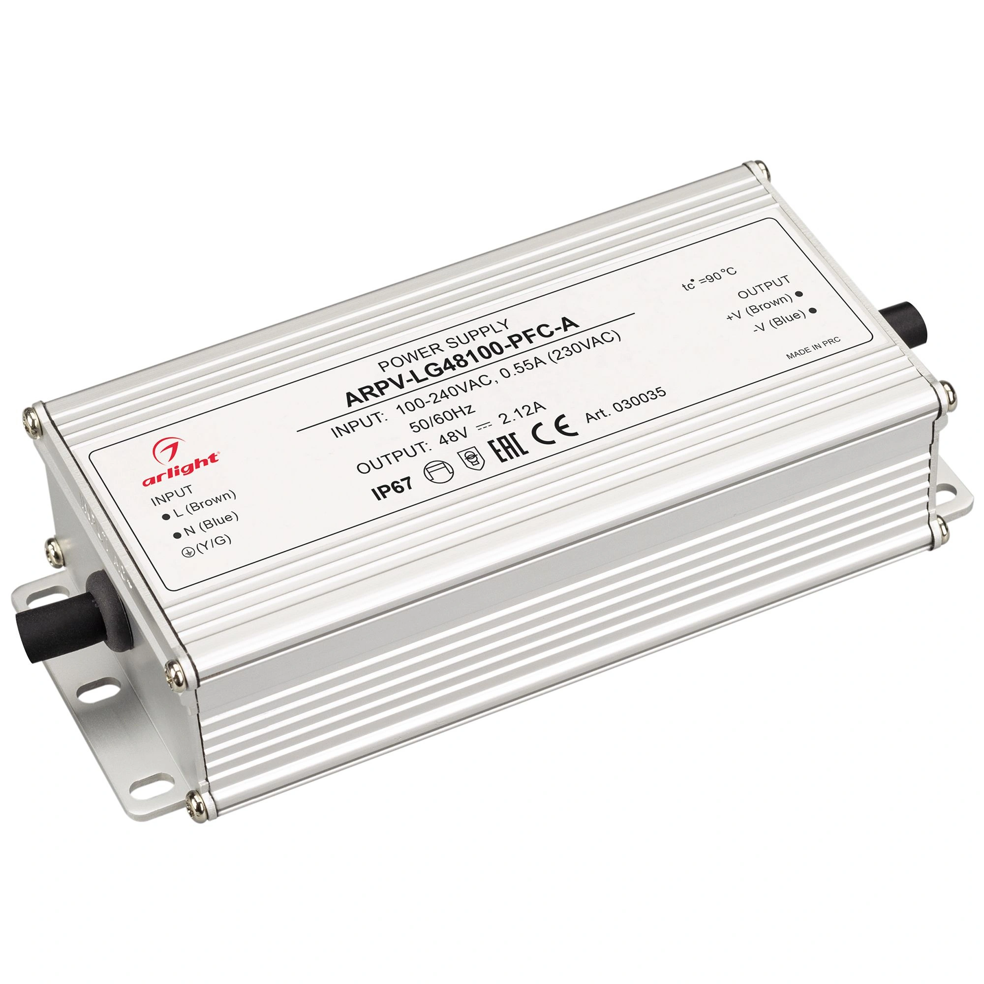 Источник напряжения с гальванической развязкой для светодиодных изделий. Входное напряжение 100-240 VAC. Выходные параметры: 48 В, 2.1 А, 100 Вт. Встроенный PFC >0,98. Герметичный пластиковый корпус IP 67. Рабочая температура -40…+70C⁰. Габаритные размеры длина 150 мм, ширина 67.5 мм, высота 35.5 мм. Гарантийный срок 5 лет.