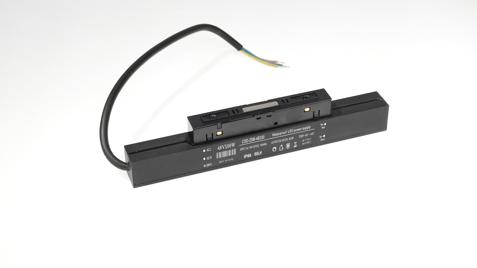 Источник стабилизированного напряжения 48V 100W 2A. Встраиваемый в трек S20, R20, S35, R35 .Степень защиты IP66. Входное напряжение 100-265V, выходное напряжение 48V. Рабочая температура -40 - +60 градусов. Размеры 220x23x45мм. Длина провода 300мм. Вес 310г.