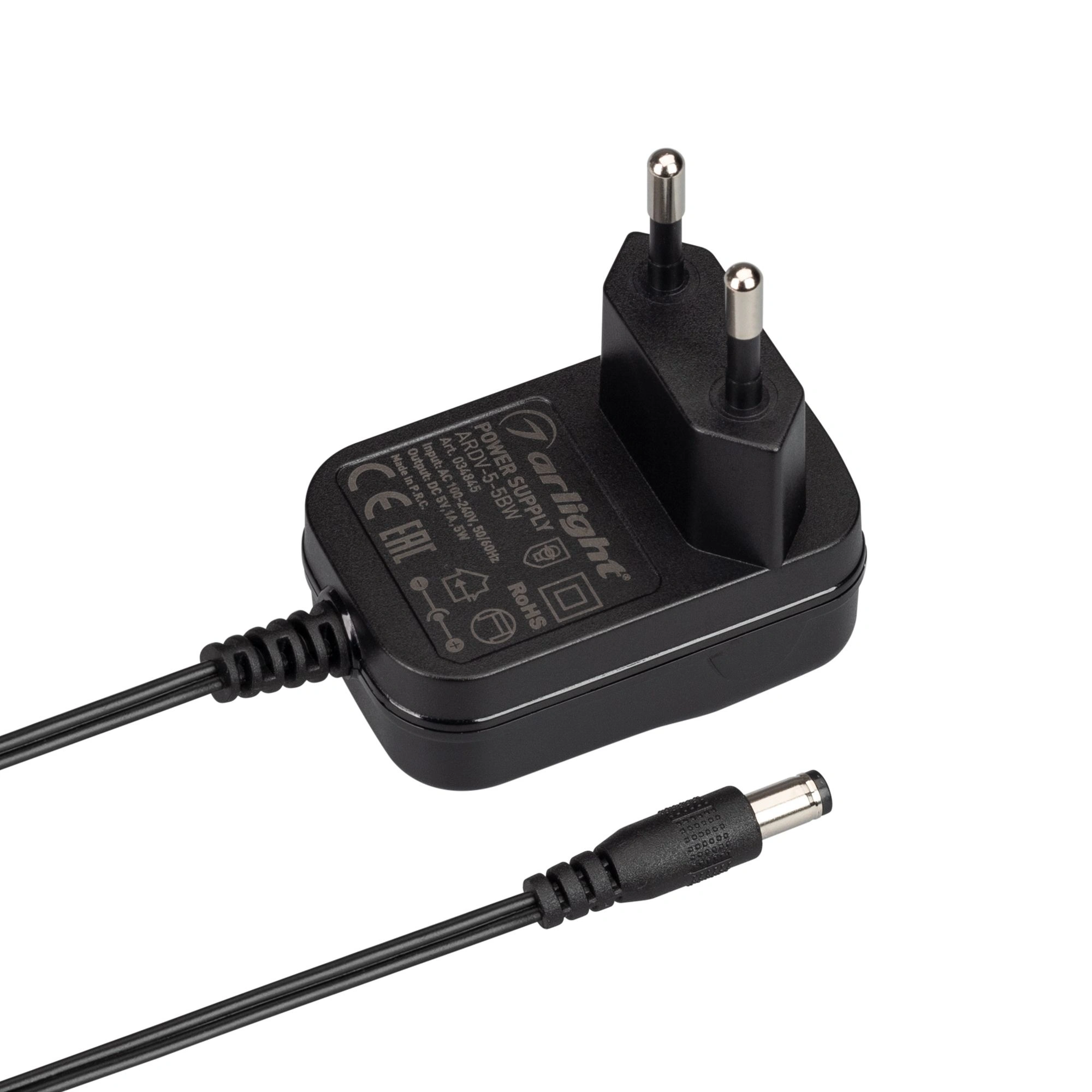 Сетевой адаптер с гальванической развязкой для светодиодных изделий 5 В (черный корпус). Мощность 5Вт. Вход:100-240VAC, Выход: DC5V 1A, длина кабеля 1.5м коннектор 5.5x2.1x10мм. Размер 58x37x24 мм (размер без вилки). Гарантия 3 года.