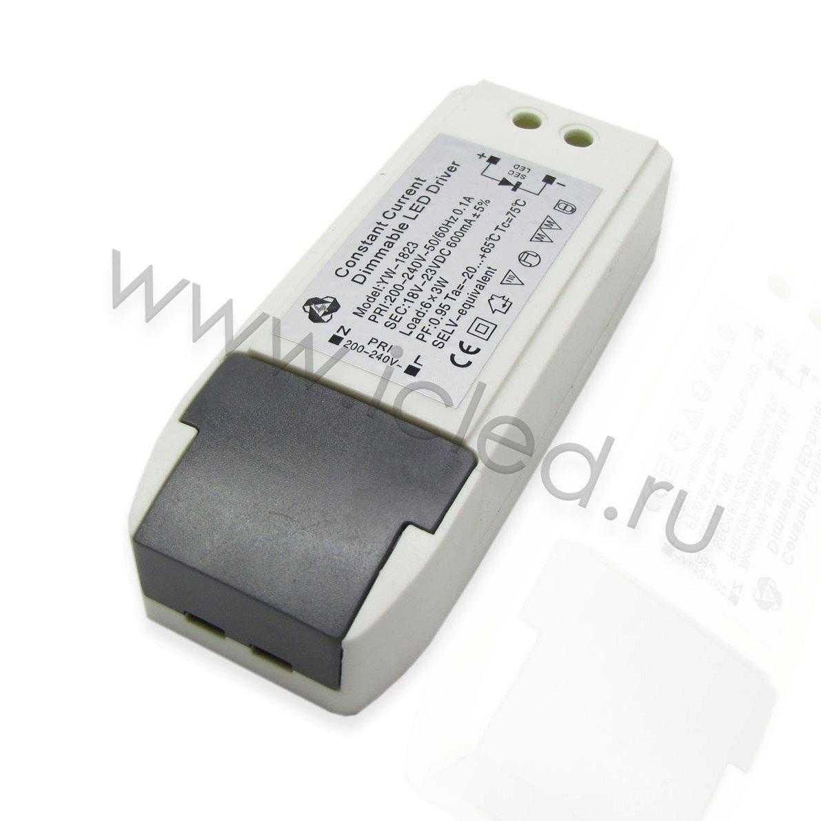 Драйвер диммируемый для мощных светодиодов. Пластиковый корпус. Напряжение питания 200-240V, выходное напряжение 18-23V, выходной ток 600mA, мощность 14W. Для 6-7 штук 2W светодиодов. Класс защиты IP40. Размеры 114x45x29мм. Вес 90гр.