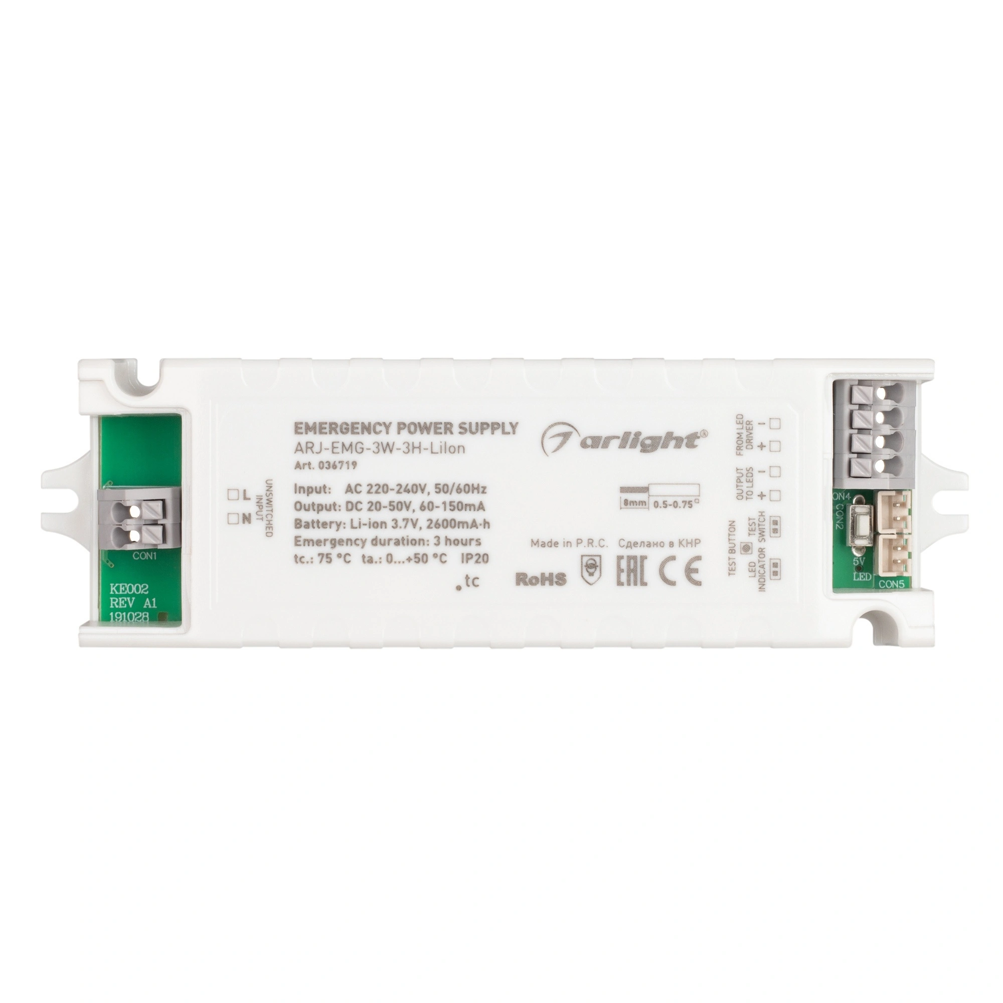 Блок аварийного питания с гальванической развязкой для светильников и мощных светодиодов. Входное напряжение 220-240 VAC. Выходные параметры: 2-2.5Вт, 20-50 В, 60-150 mА. PF>0.4. Мощность заряда батареи 3Вт. Негерметичный пластиковый корпус со встроенной аккумуляторной батареей IP 20. Ёмкость батареи 2600 мАч, напряжение 3.7В, время работы от АКБ до 3 ч в зависимости от нагрузки. Габаритные размеры длина 122 мм, ширина 42 мм, высота 22мм. Гарантийный срок 2 года.