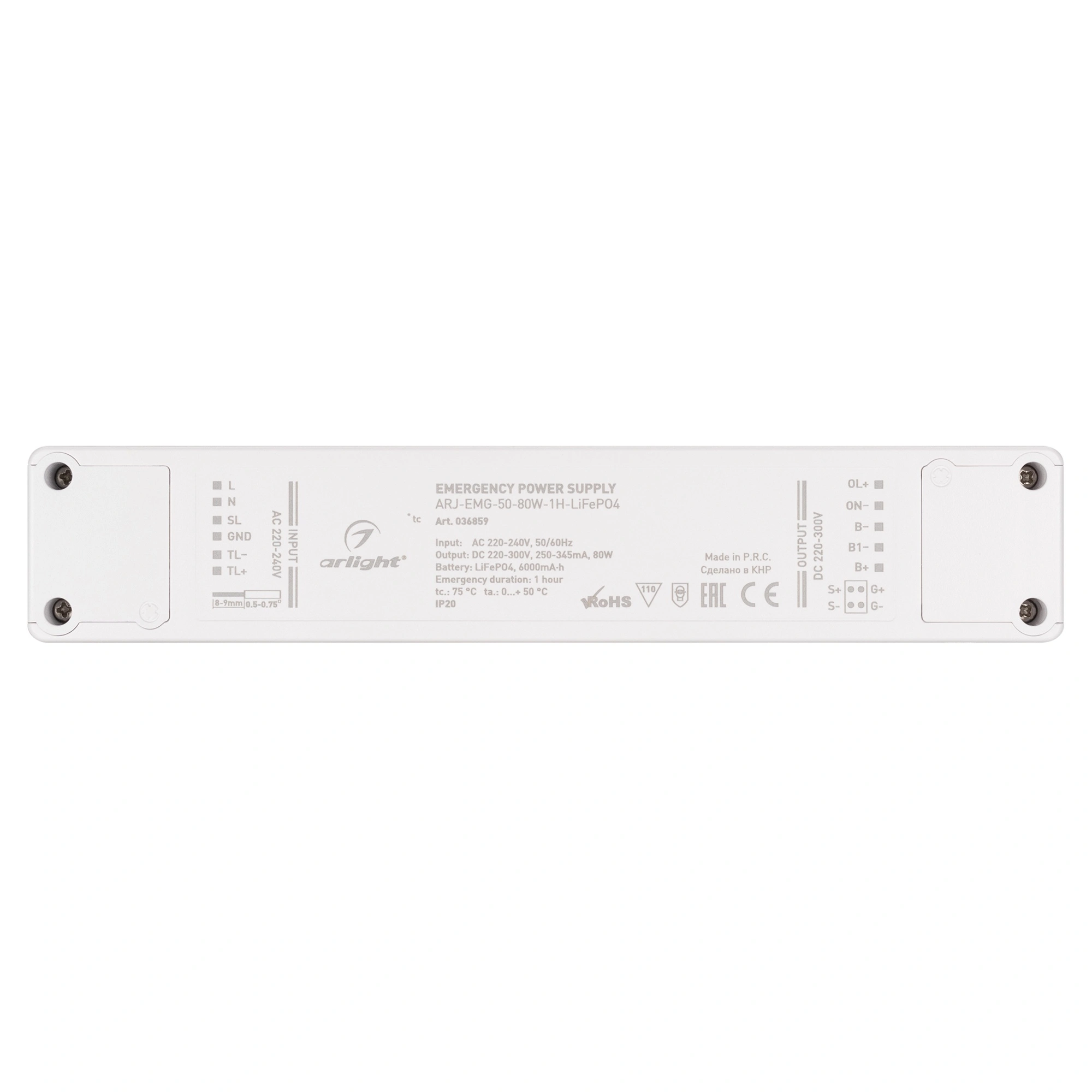 Блок аварийного питания с гальванической развязкой для группы светильников. Входное напряжение 220-240 VAC. Выходное напряжение: 220-300 VDC (подстраивается под блок питания). Допустимая мощность нагрузки: 76Вт. Встроенный PFC >0.91. Негерметичный пластиковый корпус с внешней аккумуляторной батареей LiFePO4 (поставляется в комплекте) IP 20. Ёмкость батареи 6000 мАч, напряжение 9.6В, максимальная мощность БАПа в режиме заряда 80Вт, время работы от АКБ от 1 ч в зависимости от нагрузки. Габаритные размеры блока питания длина 214 мм, ширина 41 мм, высота 27мм, габаритные размеры АКБ длина 278мм, ширина 73мм, высота 36мм. Гарантийный срок 3 года.