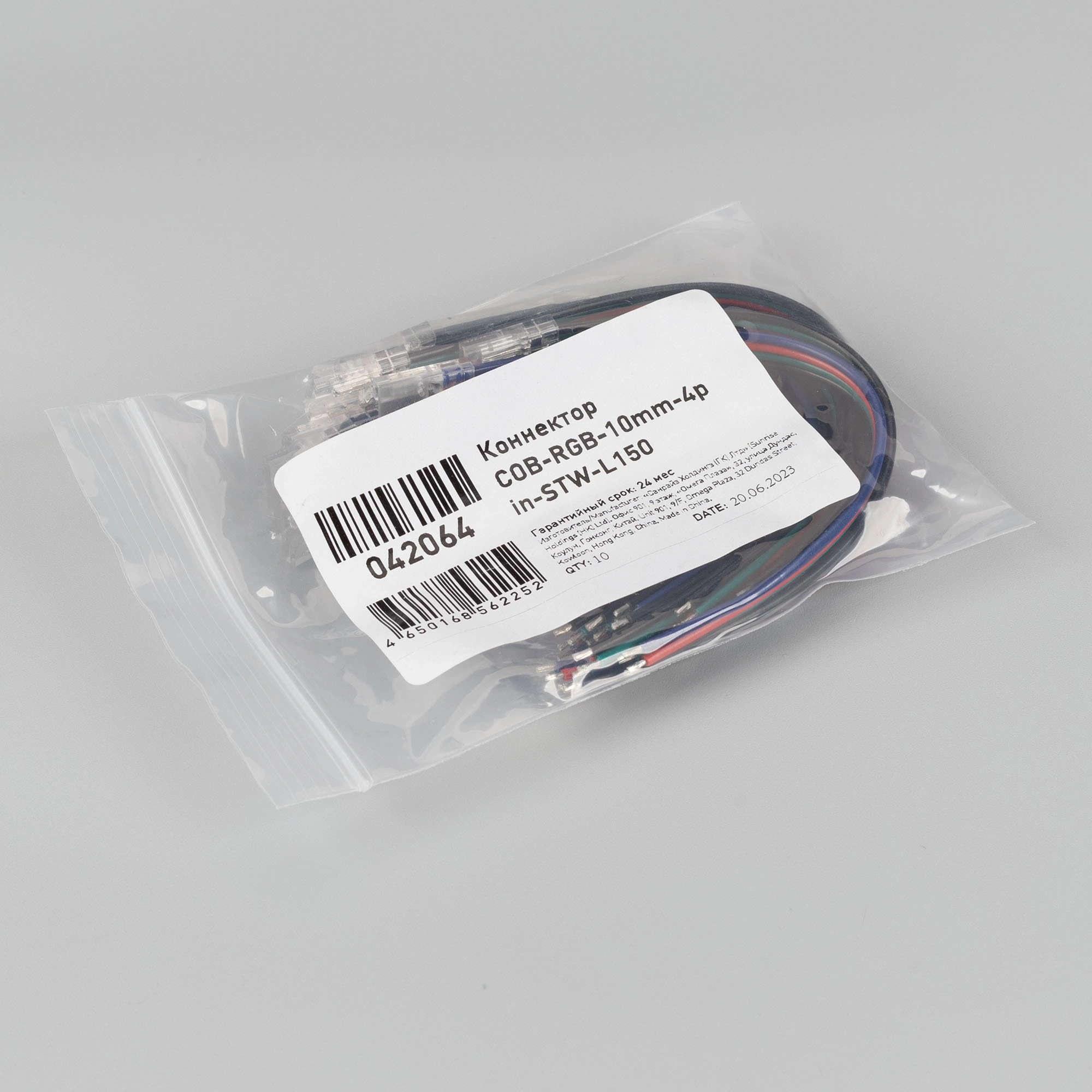 Одиночный коннектор (с проводом 150мм) для подключения питания к открытым IP20 COB лентам RGB и MIX свечений, шириной 10 мм. Материал - прозрачный пластик. Обеспечивает соединение без видимых разрывов. Максимальный допустимый ток 3 А, номинальное напряжение 24 В, степень защиты IP20. Цена за 1шт.