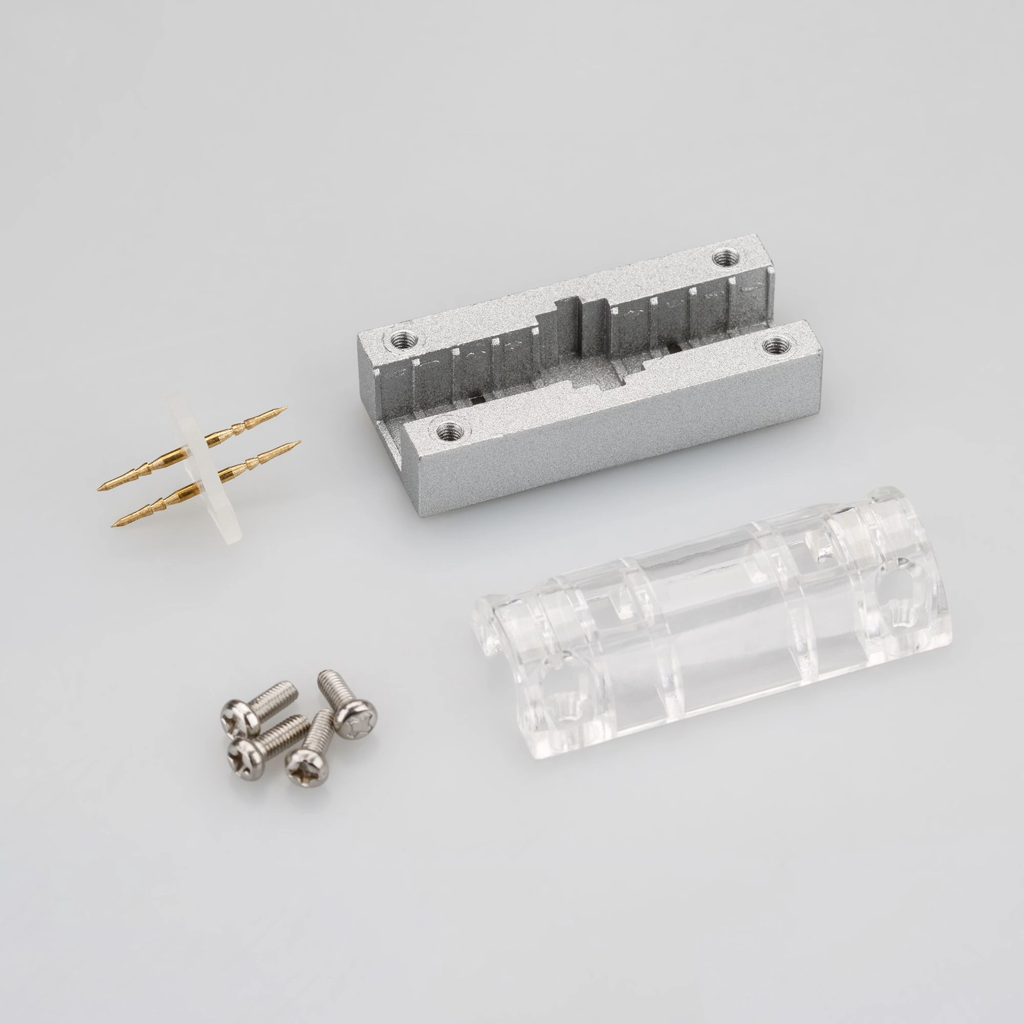 Прямой двухконтактный соединитель подходит для герметичной ленты сечения 16x8 мм из серии NEON. Он обеспечивает непрерывное соединение и создает сплошную линию свечения без разрывов. Для достижения уровня защиты IP65, требуется дополнительная герметизация при соединении. Соединитель изготовлен из алюминия и прозрачного пластика, что придает ему прочность и эстетичный вид. Размеры соединителя составляют 50х22х20.7 мм.