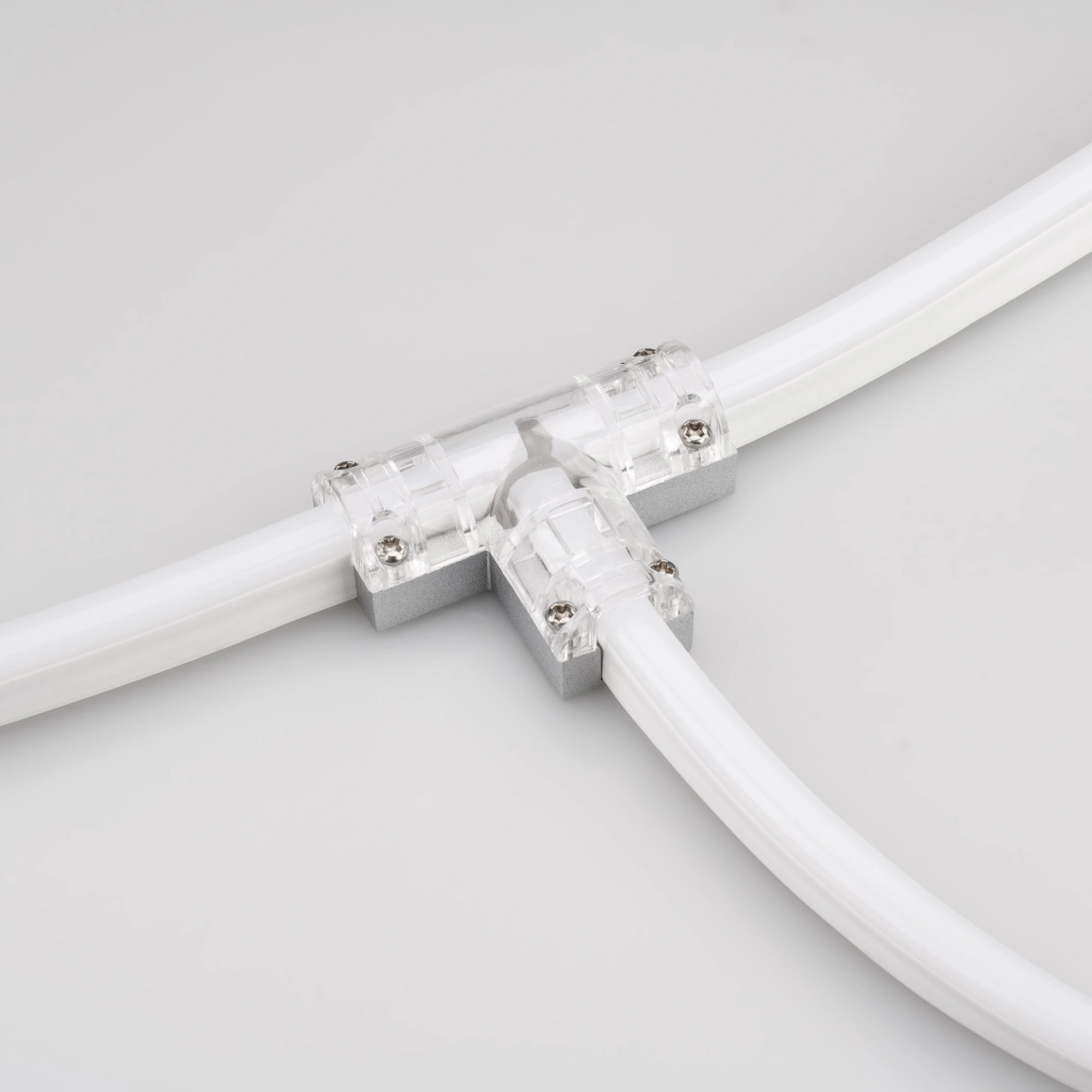 Тройной двухконтактный соединитель подходит для герметичной ленты сечения 16x18 мм из серии NEON. Он обеспечивает непрерывное соединение и создает сплошную линию свечения без разрывов. Для достижения уровня защиты IP65, требуется дополнительная герметизация при соединении. Соединитель изготовлен из алюминия и прозрачного пластика, что придает ему прочность и эстетичный вид. Размеры соединителя составляют 60х45х20.7 мм.