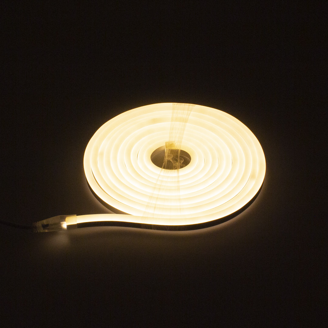 Светодиодный гибкий неон. Цвет свечения теплый белый 2500К. Угол свечения 120 градусов. Напряжение 220V, светодиоды 2835, 120шт/м, мощность 9,6Вт/м (48Вт на 5м), размеры 5000х9х16мм. Класс защиты IP65. Шаг нарезки 1000мм. В комплекте с сетевым шнуром. Размер упаковки 360x260x50мм. Вес 1000г. Светодиодный гибкий неон 220V наиболее востребован в рекламных вывесках, интерьерах и освещении зданий в качестве контурной подсветки.