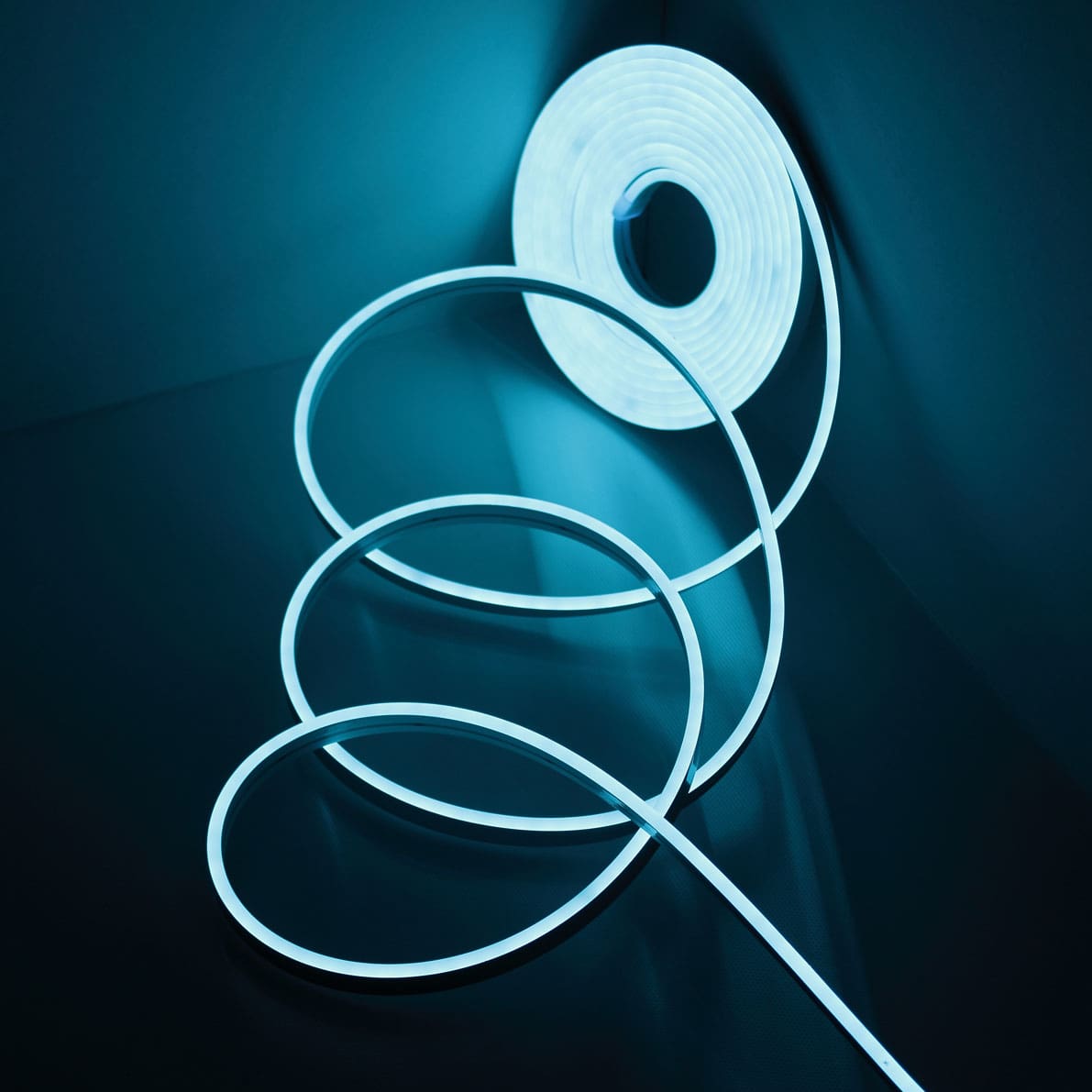 Светодиодный гибкий неон. Цвет свечения голубой. Угол свечения 120 градусов. Напряжение 12V, светодиоды 2835, 120шт/м, мощность 9,6Вт/м, размеры 5 000х4.5х13мм. Класс защиты IP65. Шаг нарезки 25мм. В комплекте с гнездом 5,5х2,1мм.Размер упаковки 270x220x25мм. Вес 460г. Светодиодный гибкий неон 12V наиболее востребован в рекламных вывесках, освещении зданий в качестве контурной подсветки, авто-мото тюнинге. Низковольтное питание неона безопасно при использовании во влажных помещениях и на улице.