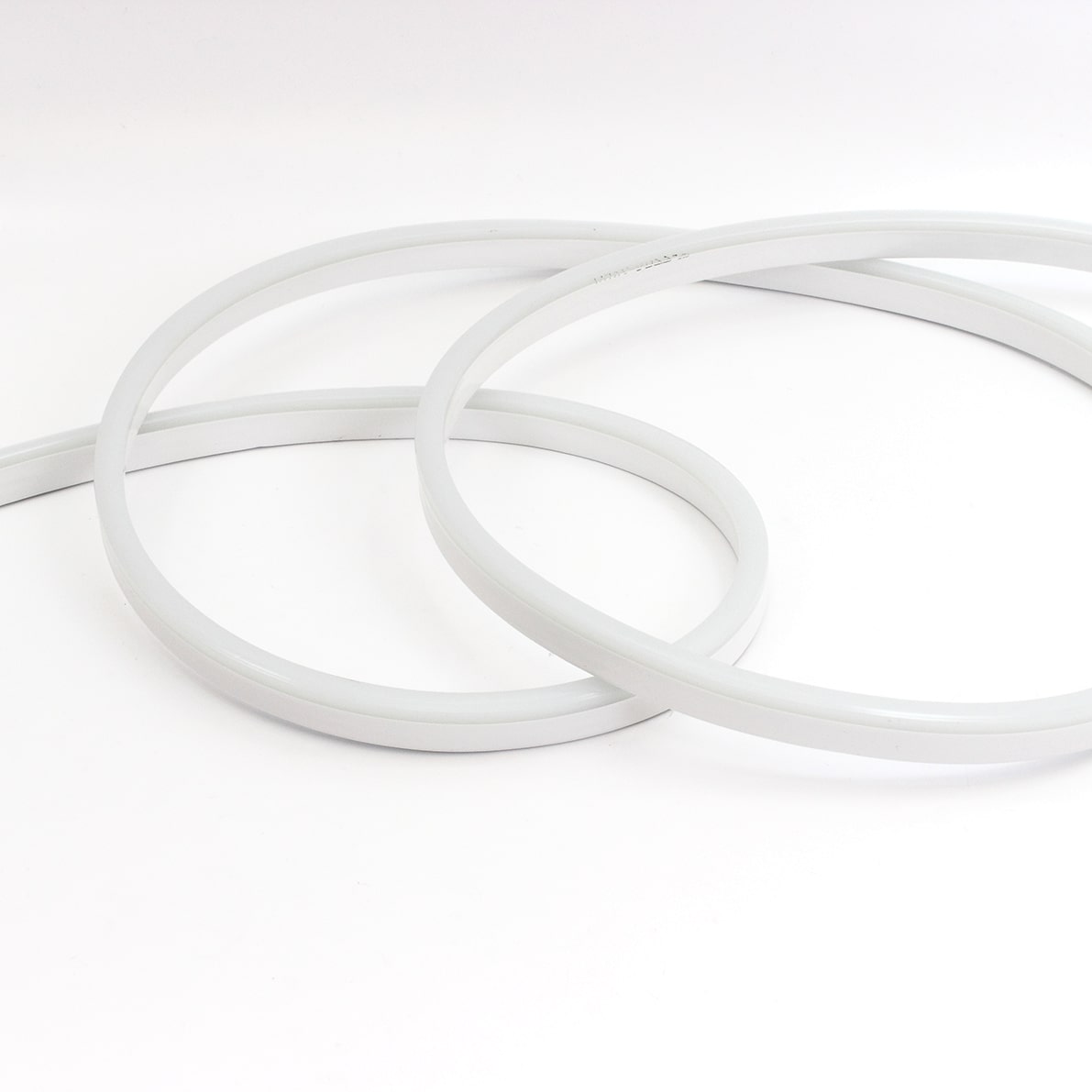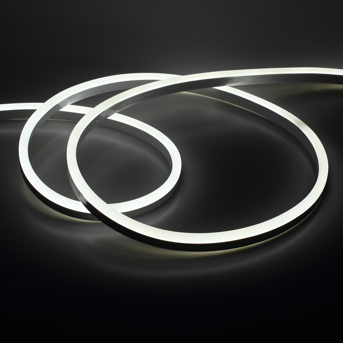 Светодиодный гибкий неон. Угол свечения 120 градусов, цвет свечения белый 6000-6500К. Напряжение 220V, мощность 9,6W на метр, размеры 50 000*8*16 мм. Класс защиты IP65. В катушке 50м. Вес 7кг. Норма отпуска от 1м, шаг нарезки 1м. Подключение производить с помощью выпрямителя АС/DC 220V. Светодиодный гибкий неон 220V наиболее востребован в архитектурном освещении зданий в качестве контурной подсветки.