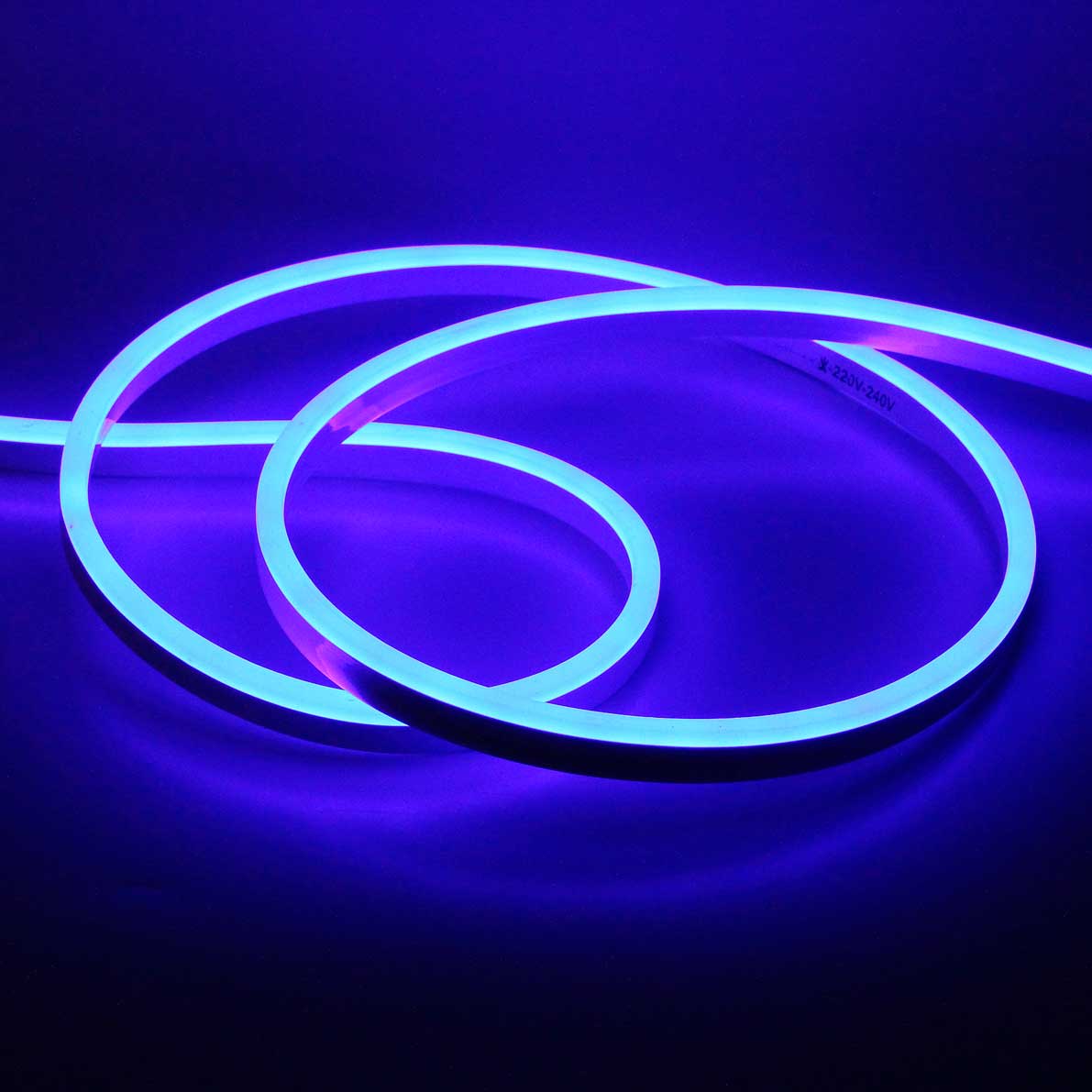 Светодиодный гибкий неон. Угол свечения 120 градусов, цвет свечения синий. Напряжение 220V, мощность 9,6W на метр, размеры 50 000*8*16 мм. Класс защиты IP65. В катушке 50м. Вес 7кг. Норма отпуска 1м, шаг нарезки 1м. Подключение производить с помощью выпрямителя АС/DC 220V. Светодиодный гибкий неон 220V наиболее востребован в архитектурном освещении зданий в качестве контурной подсветки.