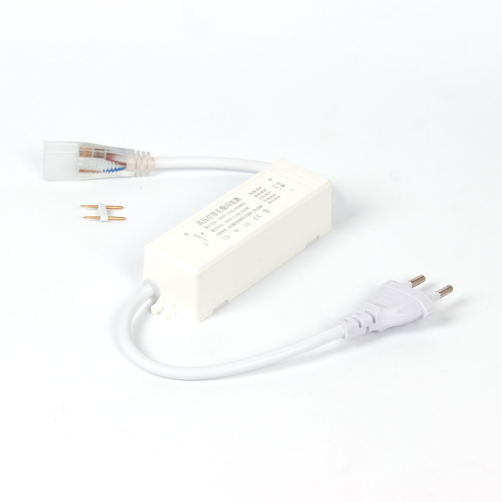 Сетевой шнур 220VAC без стробэффекта для одноцветных светодиодных лент и гибкого неона на 220VDC. Максимальная мощность 250W. Ширина между клеммами 10мм. Степень защиты IP40. Размеры 120х35х29мм. Размеры упаковки 190х65х40мм. Вес 140г.