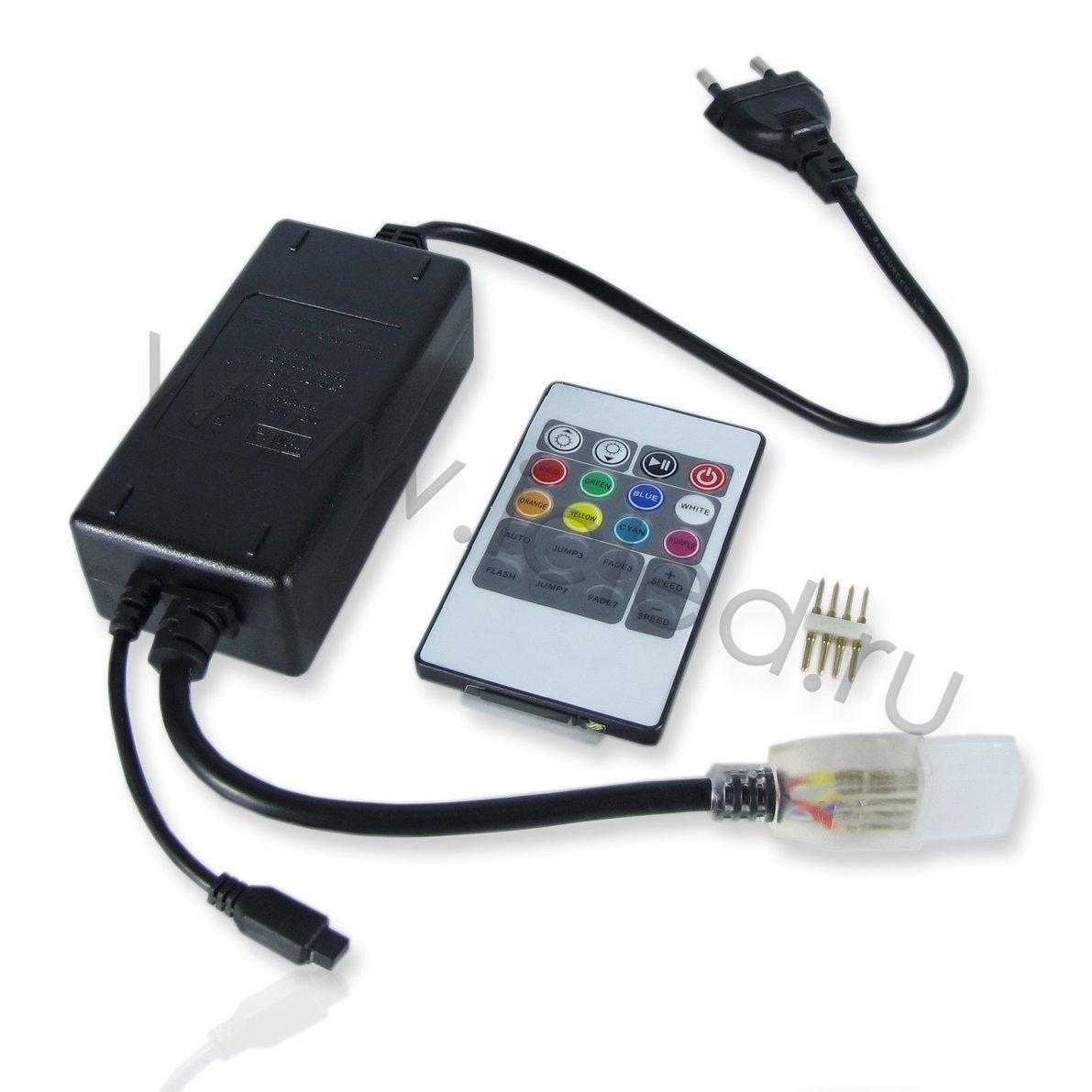 Контроллер RGB для ленты 220V. Управляется пультом по ИК сигналу. 20 кнопочный пульт в коплекте. 20 встроенных программ. Напряжение 220V, мощность 1000W. Размеры 130x60x50мм.