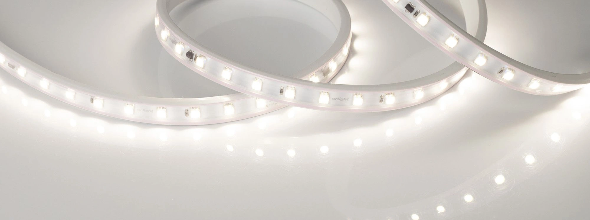 Герметичная лента в силиконовой трубке (IP65) шириной 15.5 мм. Светодиоды SMD 5060 (54 шт/м) теплого белого цвета свечения (2700 К) с высоким индексом цветопередачи (CRI>90). Лента подключается непосредственно к сети переменного тока 230 В и не требует использования источников питания. Использование интегральных стабилизаторов тока позволяет подключать ленту длиной до 50м, обеспечивая при этом равномерную яркость свечения по всей ленты. При подключении нескольких лент, подавать питание на каждые 50м отдельным кабелем. Запрещается последовательное подключение лент более 50м. Равномерное и яркое свечение по всей длине ленты обеспечивается стабилизаторами тока. Подсветка потолочных ниш, декоративная подсветка, создание контуров рекламных объектов. Может использоваться в помещениях и на улице. В комплект входит заглушка и провод питания. Крепление на скобы или профиль (приобретаются дополнительно). Диммирование осуществляется диммерами TRIAC в диапазоне 15%-90%.