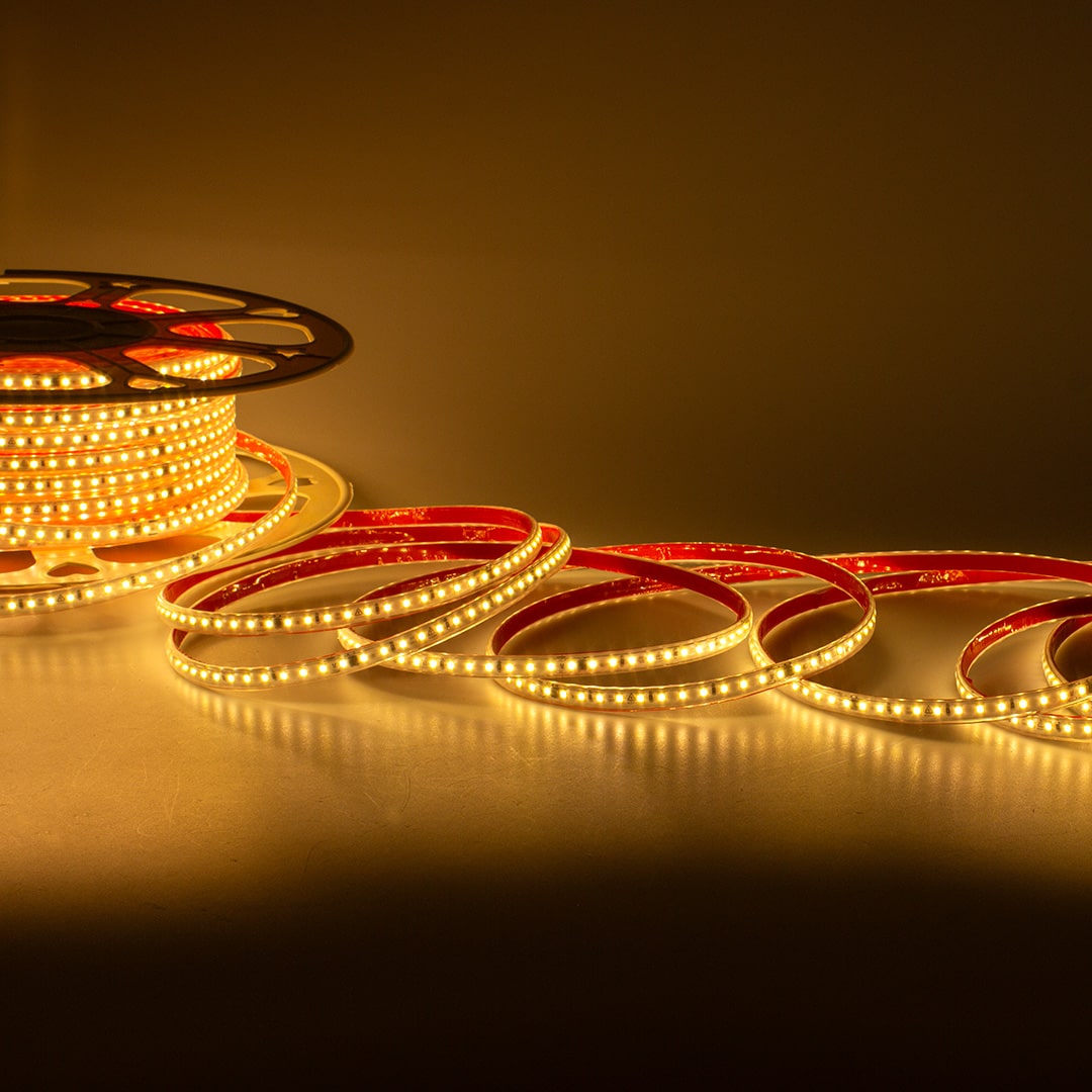 Светодиодная лента. Тип светодиода 2835, 120 светодиодов на метр, угол свечения 120 градусов, цвет свечения теплый белый 2700-3200K. Напряжение 220V, мощность 9.6W на метр, световой поток 900Lm размеры10x4x50 000 мм. Кратность реза 100мм. Класс защиты IP65. В катушке 50м. Размеры коробки 330х330х100мм. Вес 2300г. Норма отпуска от 1м. Внимание! Высокое напряжение, подключение осуществлять квалифицированным специалистом. Светодиодная лента 220V получила наибольшее распространение в архитектурном освещении зданий в качестве контурной подсветки.