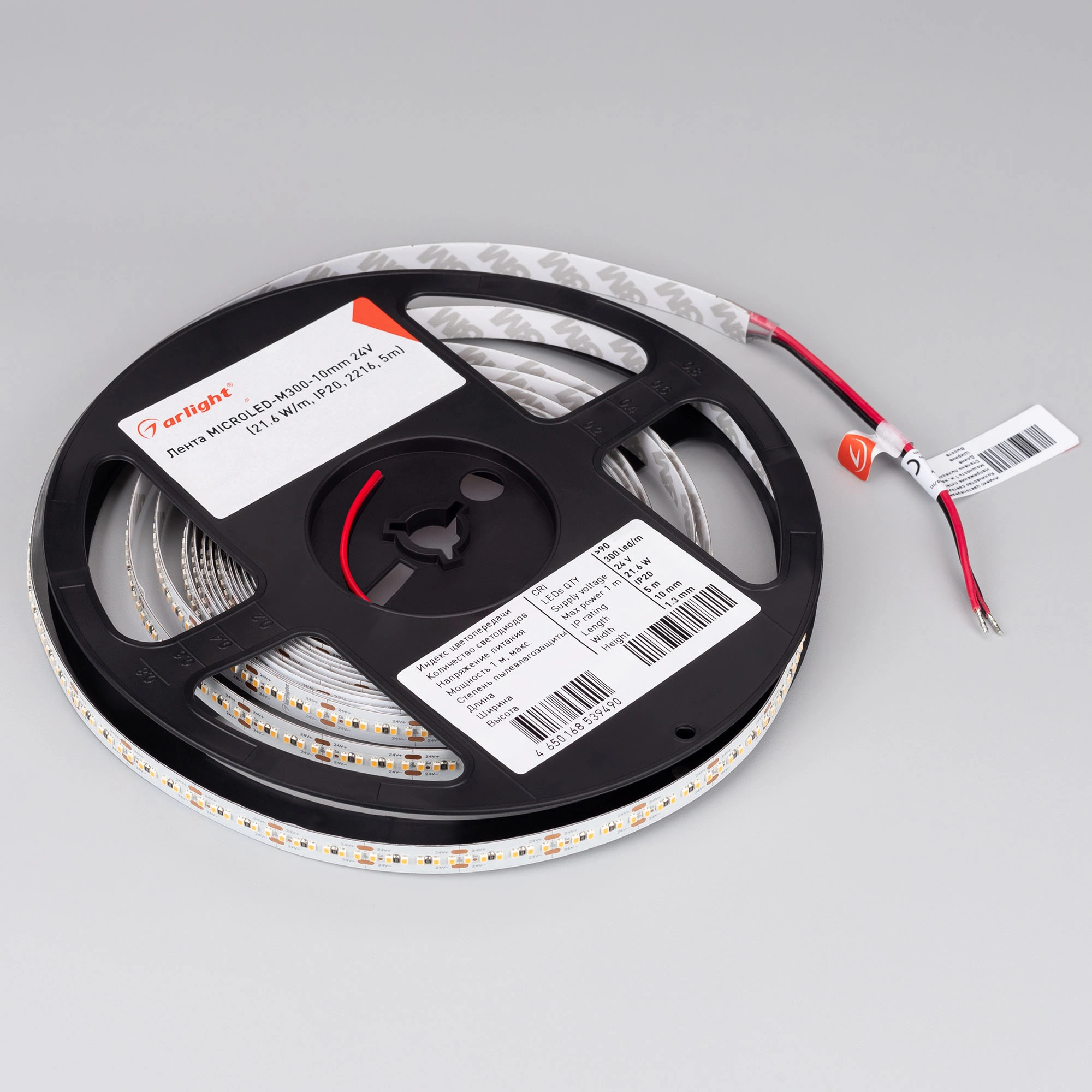 Светодиодная лента MICROLED-M300, открытая. Светодиоды 2216, 300 шт/м (1500 шт на 5 м), белая плата, ширина 10 мм, скотч 3M. Цвет БЕЛЫЙ 6000 K, цветопередача CRI>90, угол 120°. Питание 24V, мощность 21.6 Вт/м (108 Вт на 5 м). Размеры 5000x10x1.3 мм. Мин. отрезок 20 мм, 6 светодиодов. Цена за 1 м.