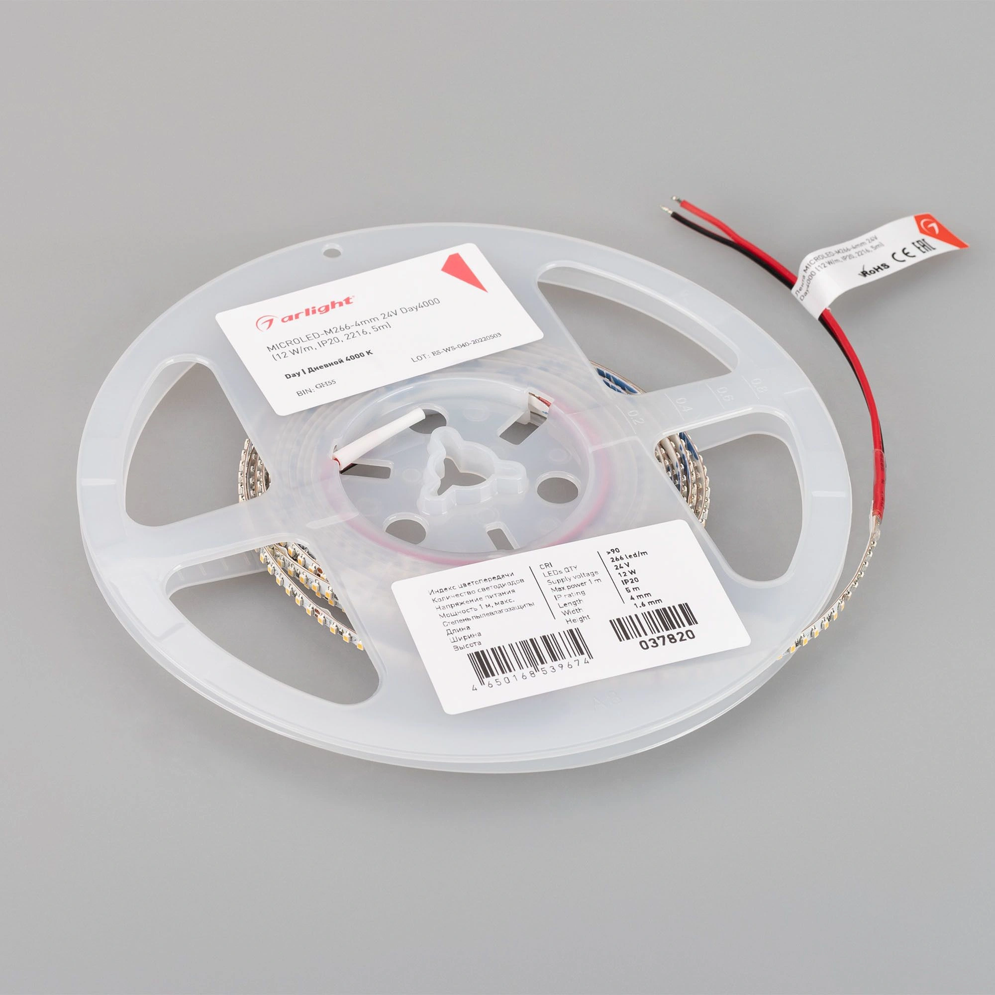 Светодиодная лента MICROLED-M266, открытая IP20. Светодиоды 2216, 266 шт/м (1330 шт на 5 м), белая плата 4 мм, скотч 3M. Цвет ДНЕВНОЙ 4000 K , цветопередача CRI>90, угол 120°. Питание 24 В, мощность 12 Вт/м (60 Вт на 5 м). Размеры 5000x4x1.6 мм. Мин.отрезок 26,4 мм, 7 светодиодов. Цена за 1м.