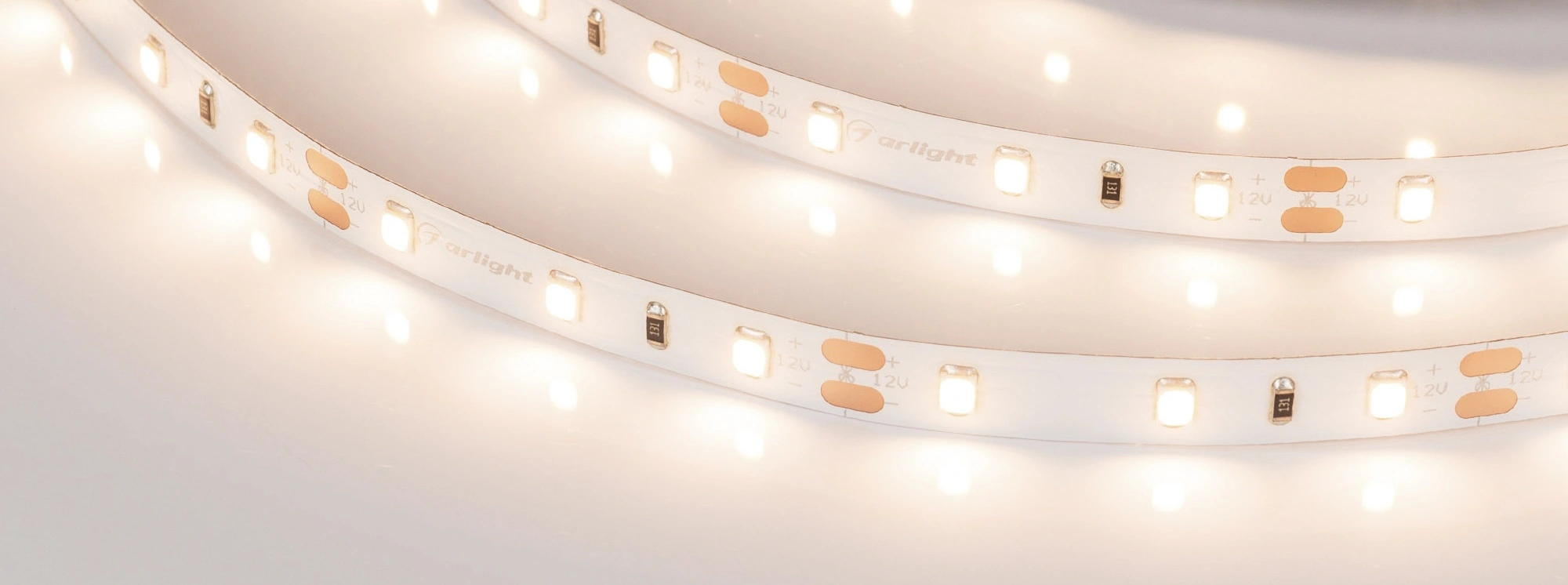 Светодиодная лента RT-A60, открытая. Светодиоды 2835, 60 шт/м (300 шт на 5 м), белая плата, ширина 8 мм, скотч 3M. Цвет ТЁПЛЫЙ 3000 K, цветопередача CRI 95..98, угол 120°. Питание 12V, мощность 4.8 Вт/м (24 Вт на 5 м). Размеры 5000x8x1.5 мм. Мин. отрезок 50 мм, 3 светодиода. Цена за 1 м.