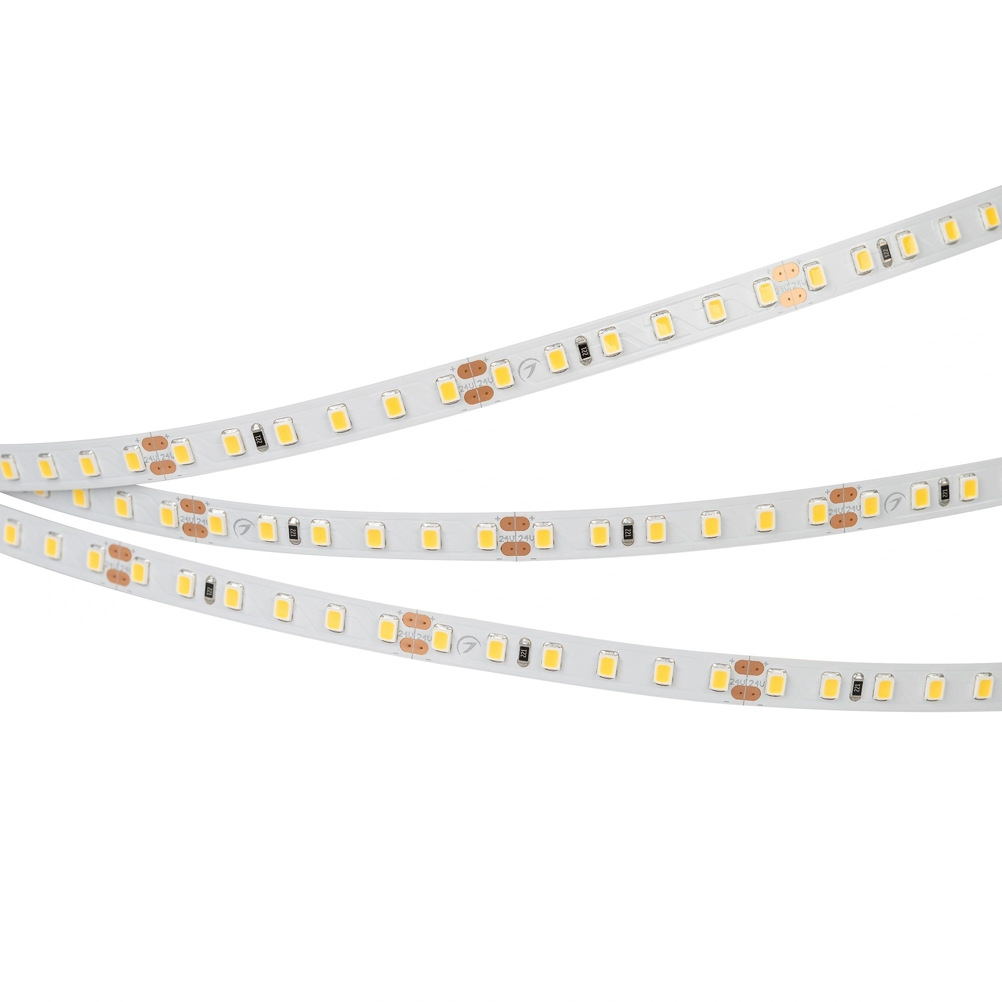 Гибкая лента CRI98, светодиоды smd 2835, 120 шт/м (600шт на 5м), белая плата 8 мм, скотч 3М. Цвет ТЁПЛЫЙ 2600-2800K. Питание 24V, мощность 14.4 Вт/м (72 Вт на 5м), угол 120°, высокая цветопередача CRI=95..98. Размеры 5000х8x1.5мм. Мин.отрезок 50мм, 6 светодиодов. Цена за 1м.