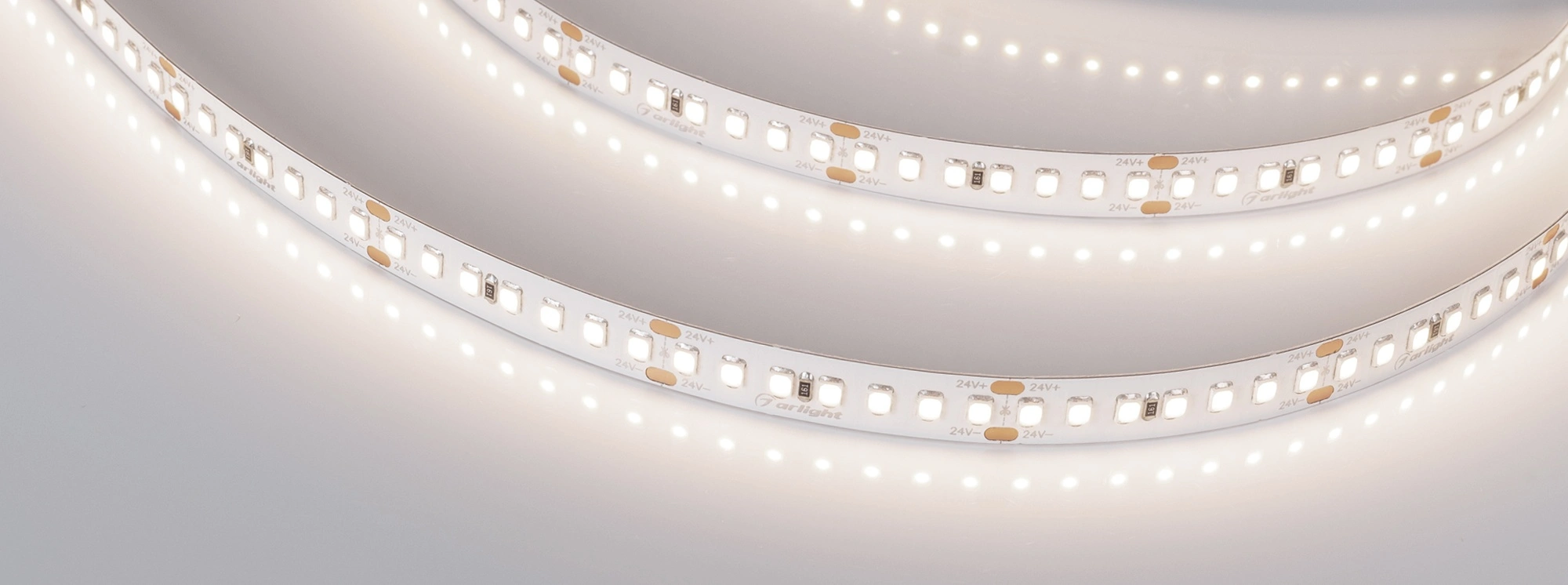 Гибкая лента LUX, светодиоды smd 2835, 168 шт/м (840шт на 5м), белая плата 10 мм, скотч 3М. Цвет ДНЕВНОЙ 3800-4200K. Питание 24V, мощность 17 Вт/м (85 Вт на 5м), угол 120°, цветопередача CRI 95..98. Размеры 5000х10x1.5мм. Мин.отрезок 41.67мм, 7 светодиодов. Цена за 1м.