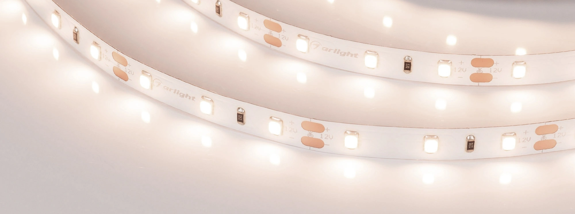 Светодиодная лента RT-A60, открытая. Светодиоды 2835, 60 шт/м (300 шт на 5 м), белая плата, ширина 8 мм, скотч 3M. Цвет ТЁПЛЫЙ 3500 K, цветопередача CRI>85, угол 120°. Питание 12V, мощность 4.8 Вт/м (24 Вт на 5 м). Размеры 5000x8x1.5 мм. Мин. отрезок 50 мм, 3 светодиода. Цена за 1 м.