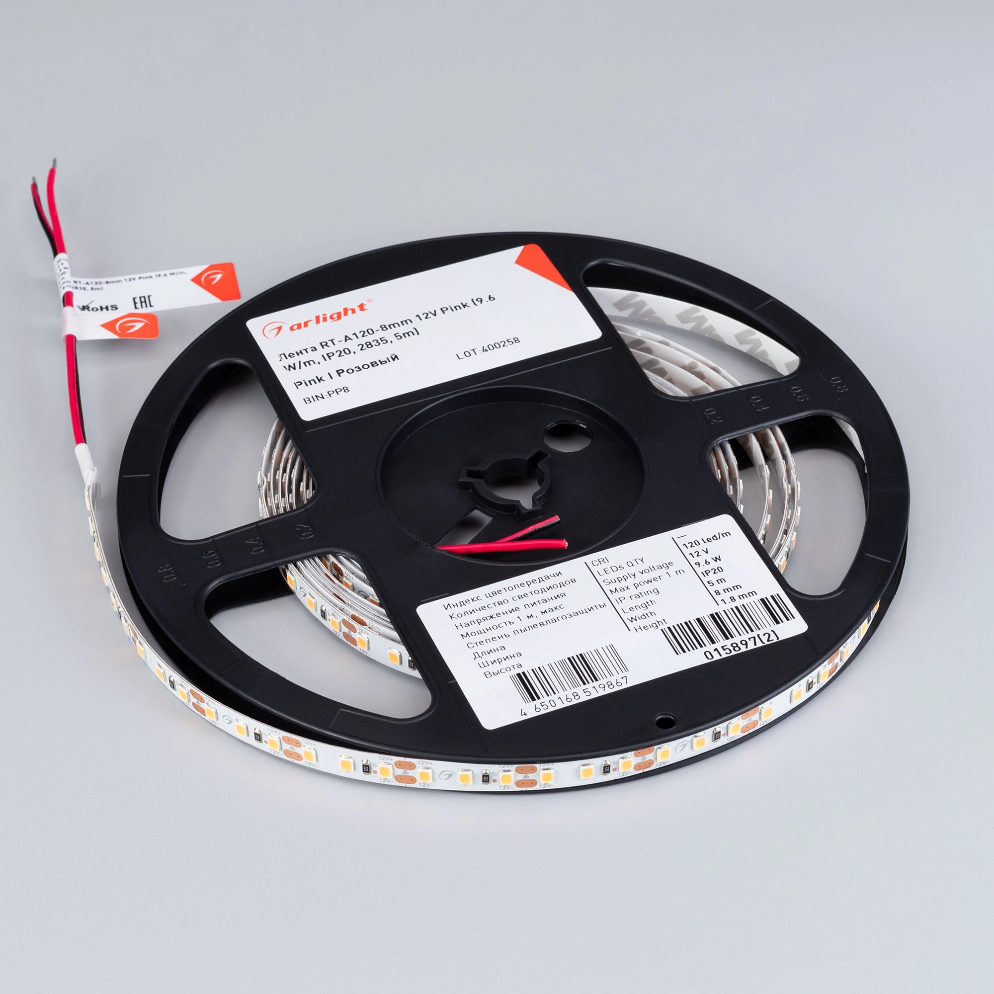 Светодиодная лента RT-A120, открытая. Светодиоды 2835, 120 шт/м (600 шт на 5 м), белая плата, ширина 8 мм, скотч 3M. Цвет РОЗОВЫЙ, угол 120°. Питание 12V, мощность 9.6 Вт/м (48 Вт на 5 м). Размеры 5000x8x1.5 мм. Мин. отрезок 25 мм, 3 светодиода. Цена за 1 м.