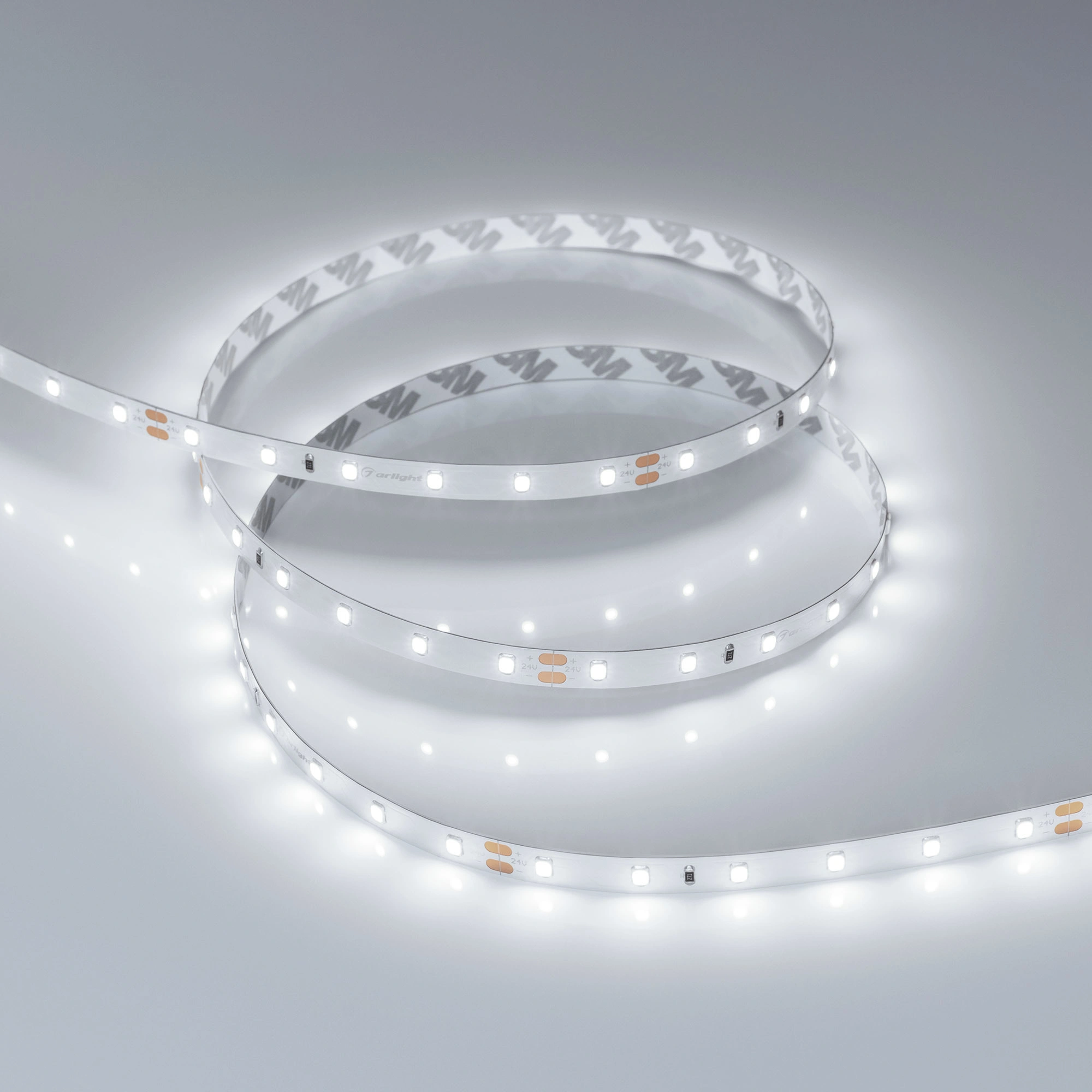 Светодиодная лента RT-A60, открытая. Светодиоды 2835, 60 шт/м (300 шт на 5 м), белая плата, ширина 8 мм, скотч 3M. Цвет БЕЛЫЙ 6000 K, цветопередача CRI>85, угол 120°. Питание 24V, мощность 4.8 Вт/м (24 Вт на 5 м). Размеры 5000x8x1.5 мм. Мин. отрезок 100 мм, 6 светодиодов. Цена за 1 м.