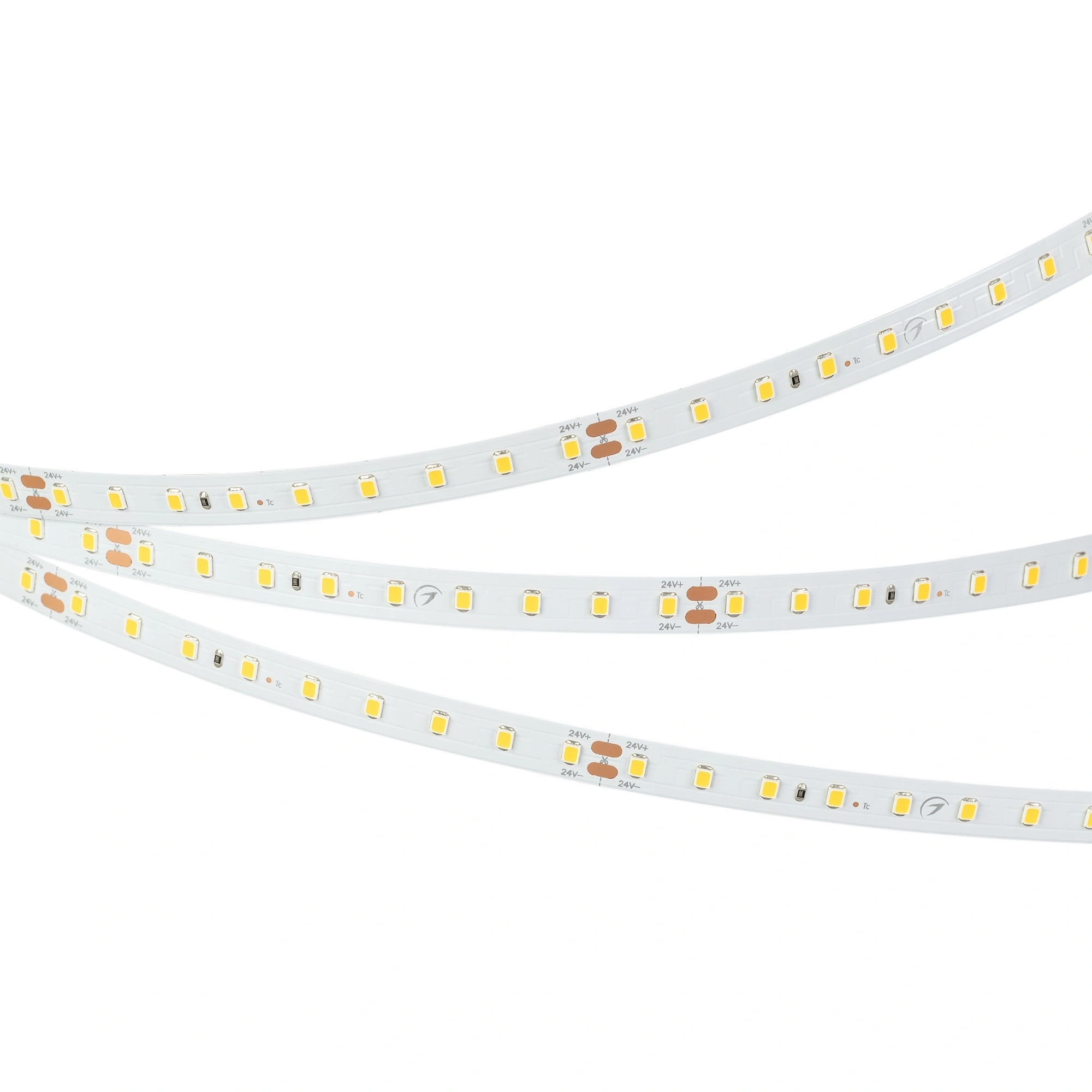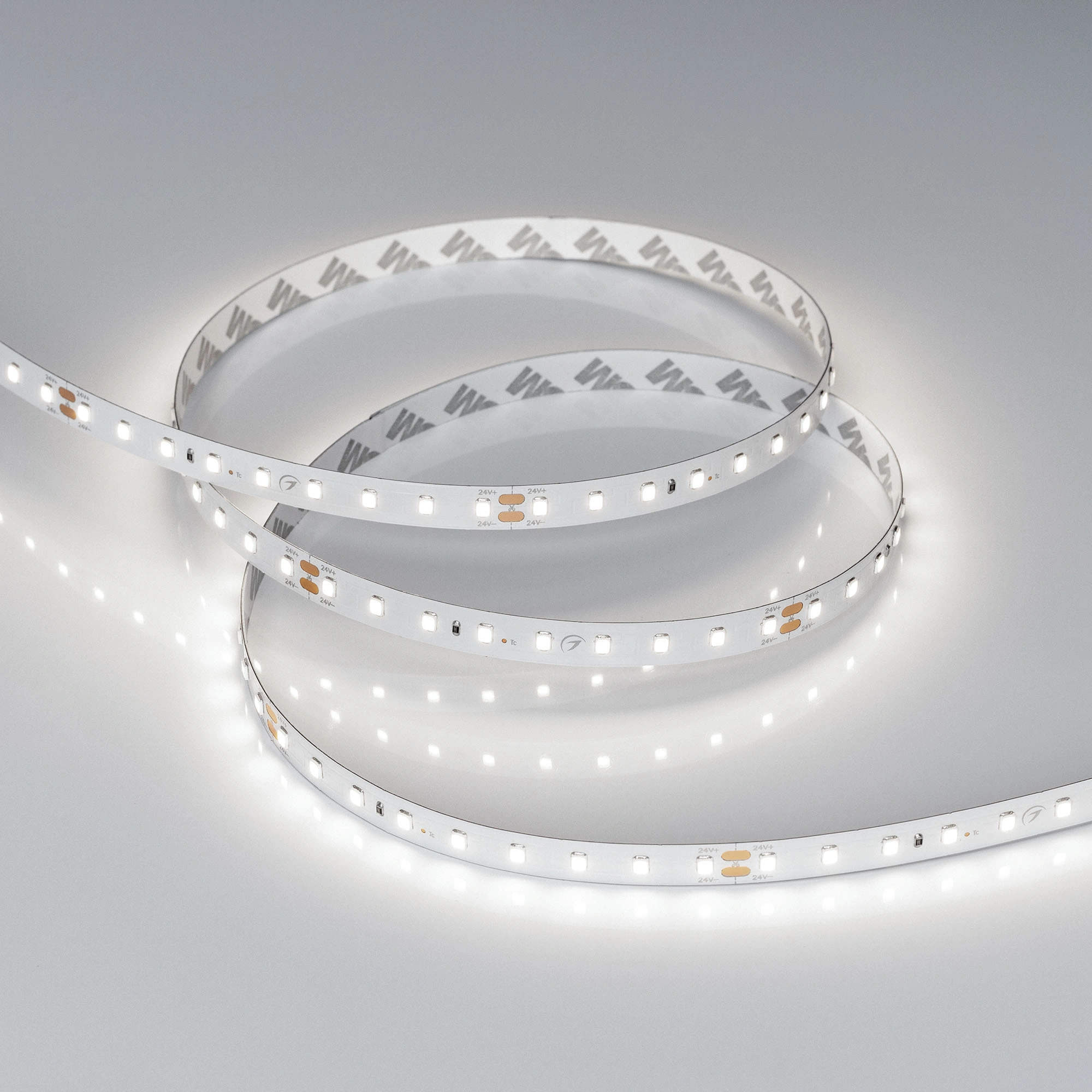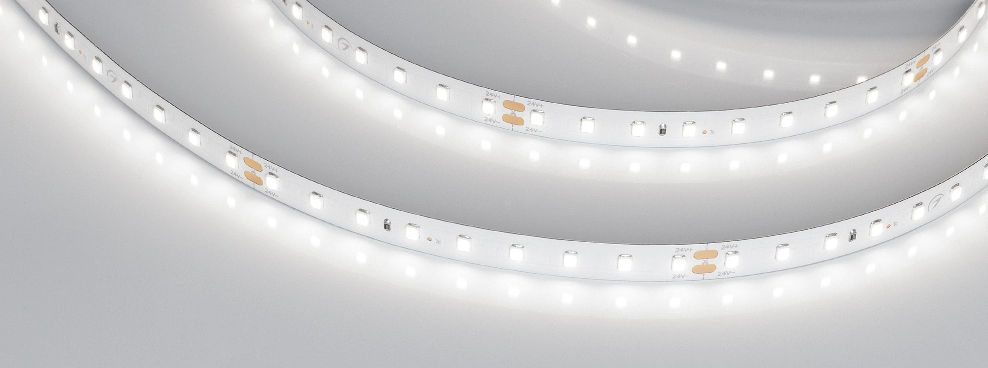 Светодиодная высокоэффективная лента RT-A90, открытая. Светодиоды 2835, 90 шт/м (450 шт на 5 м), белая плата, ширина 10 мм, скотч 3M. Цвет БЕЛЫЙ 6000 K, цветопередача CRI>85, угол 120°. Питание 24 В, мощность 4.8 Вт/м (24 Вт на 5 м). Размеры 5000x10x1.6 мм. Мин. отрезок 100 мм, 9 светодиодов. Цена за 1 м.