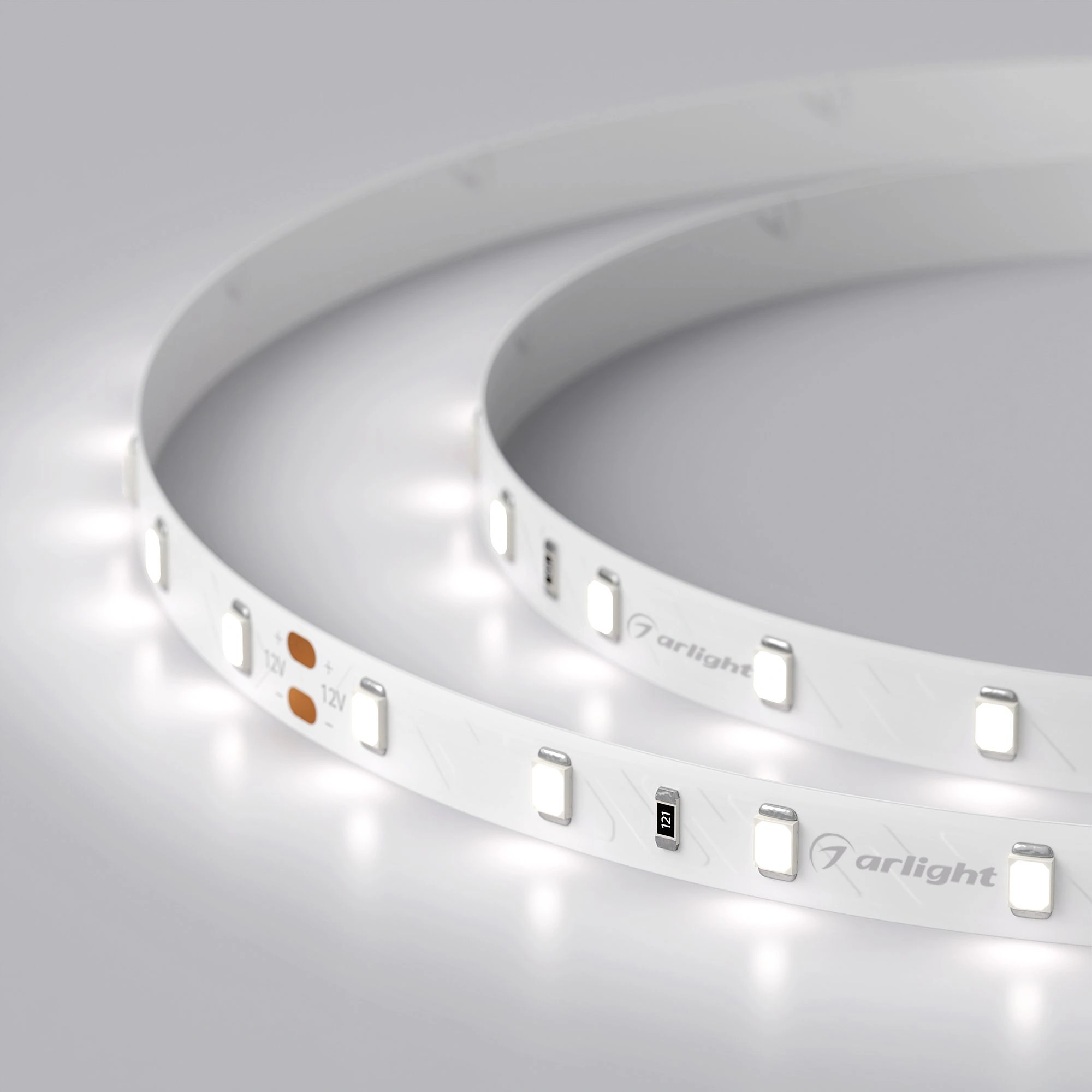 Светодиодная лента RT-A60, открытая. Светодиоды 2835, 60 шт/м (300 шт на 5 м), белая плата, ширина 8 мм, скотч 3M. Цвет БЕЛЫЙ 6000 K, цветопередача CRI>85, угол 120°. Питание 24V, мощность 7.2 Вт/м (36 Вт на 5 м). Размеры 5000x8x1.5 мм. Мин. отрезок 100 мм, 6 светодиодов. Цена за 1 м.