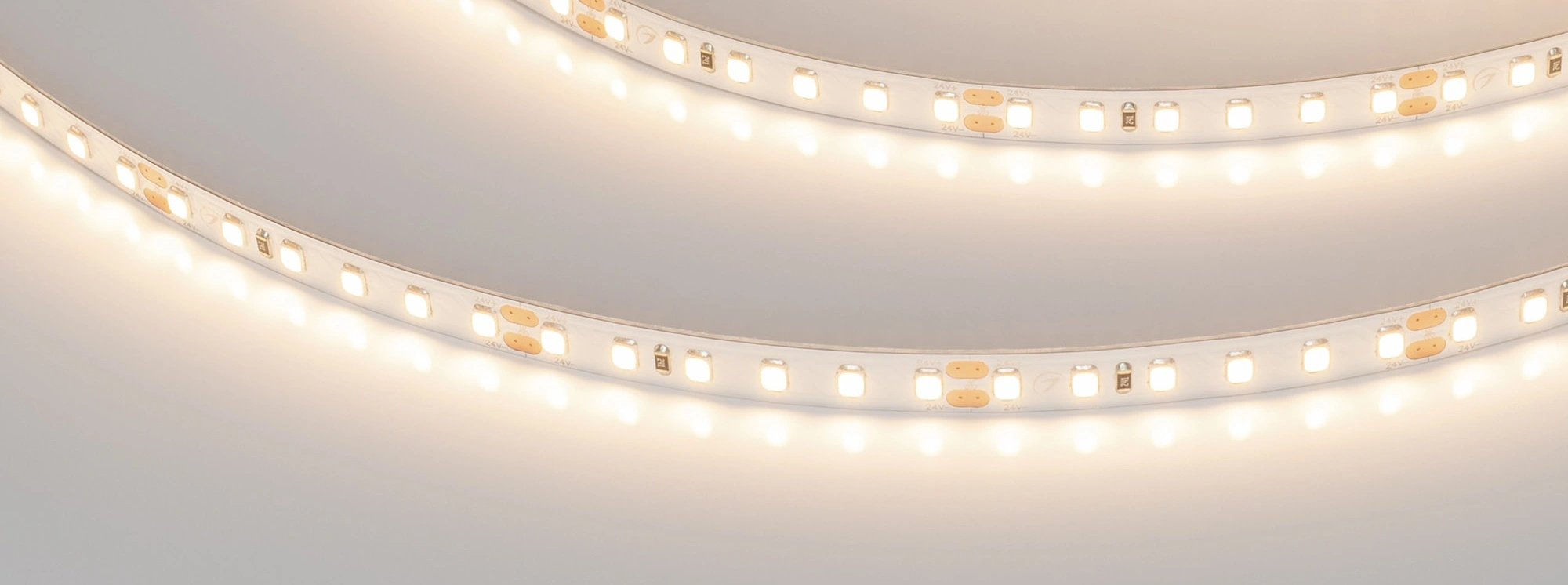 Открытая светодиодная лента шириной 8 мм и мощностью 9.6 Вт/м с индексом цветопередачи CRI>90. Светодиоды SMD 2835 (120 шт/м) теплого цвета свечения (3000 К). Напряжение питания 24 В. Минимальный отрезок 50 мм (6 светодиодов). Для декоративной подсветки интерьеров, потолочных ниш, рабочих зон кухни, мебели, рекламных конструкций и витрин.