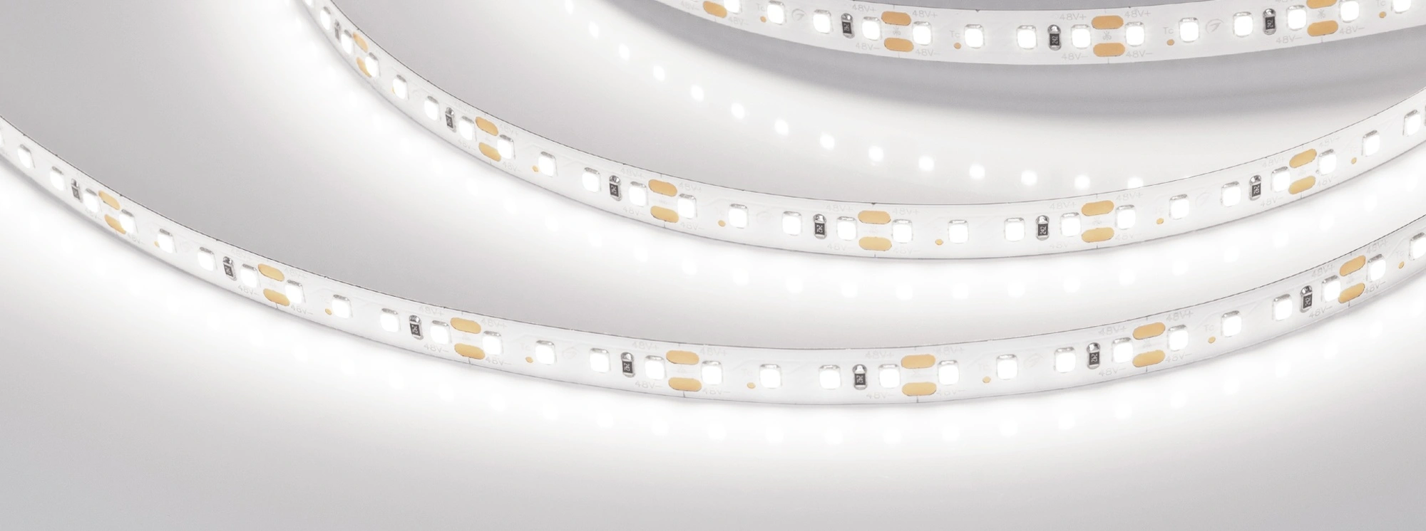 Светодиодная лента длины 30м с подключением с одной стороны (без стабилизаторов) RT-A120, открытая. Светодиоды 2835, 120 шт/м (3600 шт на 30 м), белая плата, ширина 10 мм, скотч 3M. Цвет БЕЛЫЙ 6000 K, цветопередача CRI>85, угол 120°. Питание 48 В, мощность 9.6 Вт/м (288 Вт на 30 м). Размеры 30000x10x1.6 мм. Мин.отрезок 33.3 мм, 4 светодиода. Цена за 1 м.