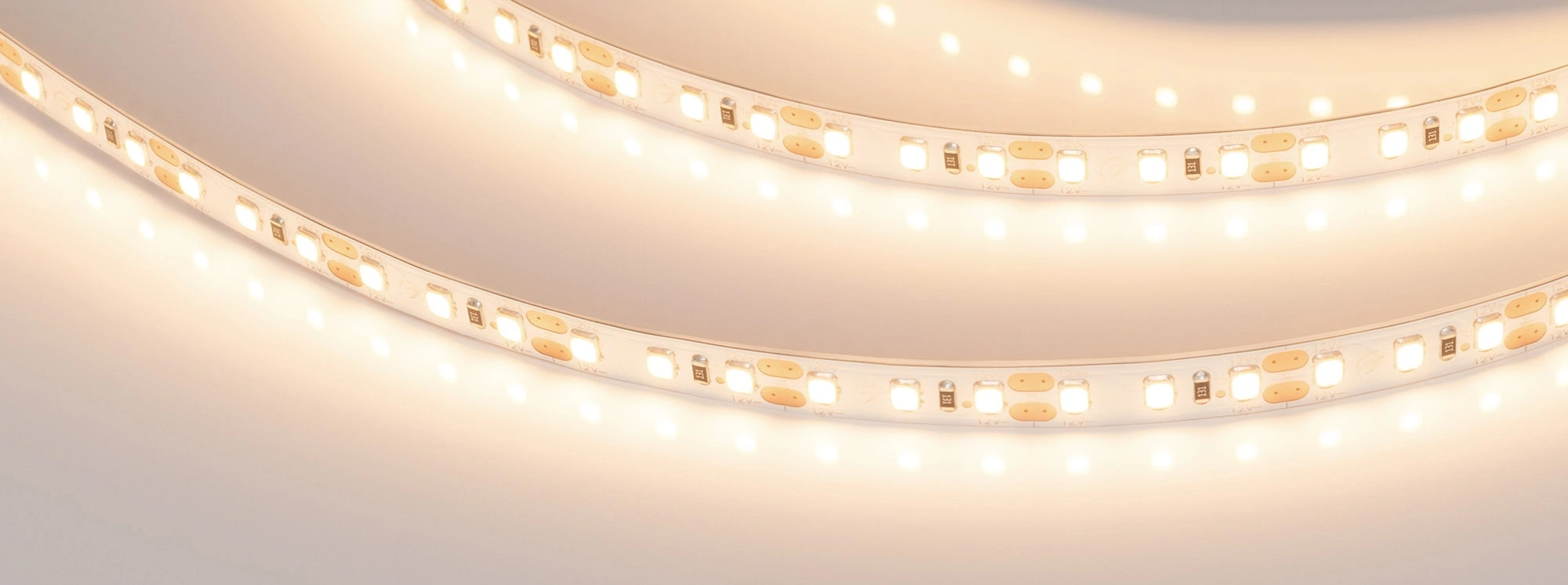 Светодиодная лента шириной 8 мм и мощностью 14.4 Вт/м с индексом цветопередачи CRI>85. Светодиоды SMD 2835 (120 шт/м) теплого белого цвета свечения (3000 К). Напряжение питания 12 В. Минимальный отрезок 25 мм (3 светодиода). Для декоративной подсветки интерьеров, потолочных ниш, а также подсветки рекламных конструкций и витрин. Обязательна установка на алюминиевый профиль.
