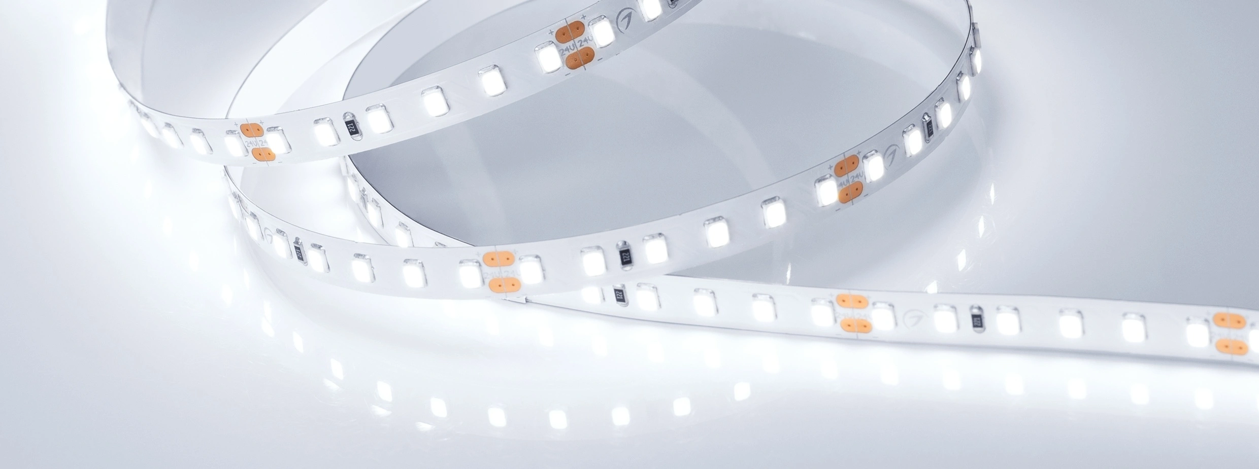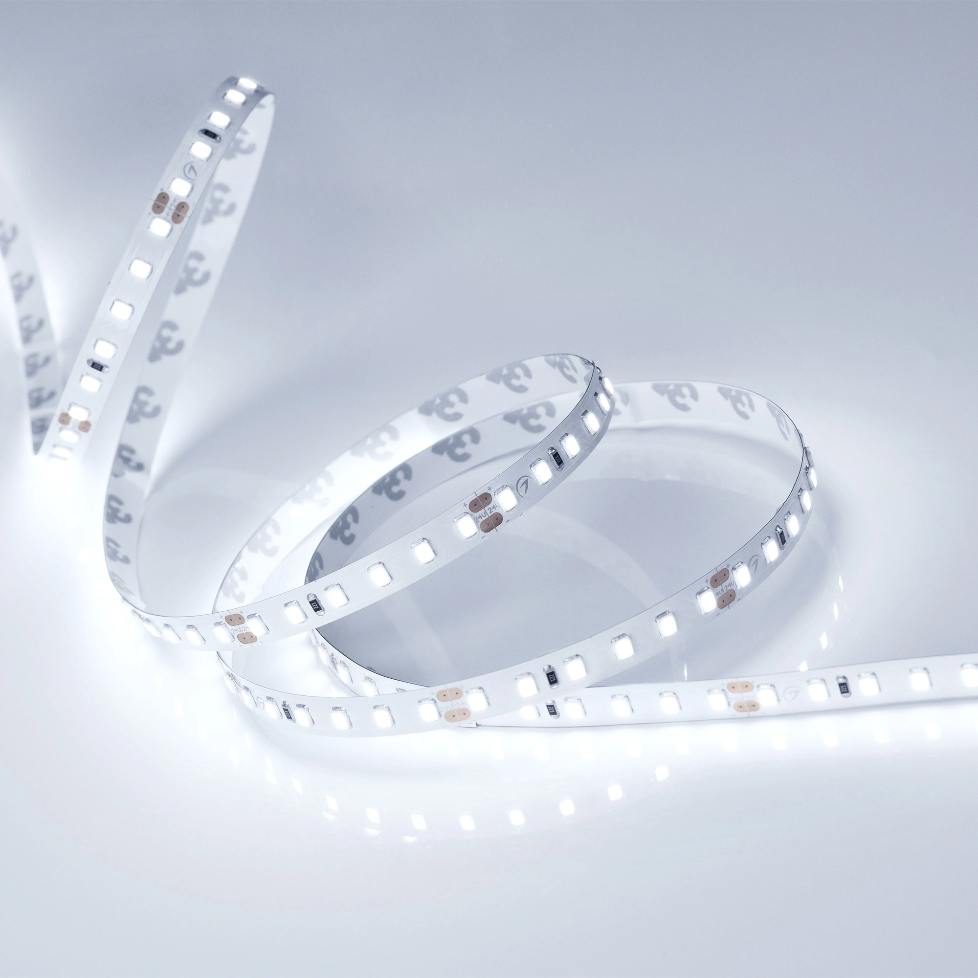 Светодиодная лента шириной 8 мм и мощностью 14.4 Вт/м с индексом цветопередачи CRI>85. Светодиоды SMD 2835 (120 шт/м) холодного белого цвета свечения (7700–9600 К). Напряжение питания 24 В. Минимальный отрезок 50 мм (6 светодиодов). Для декоративной подсветки интерьеров, потолочных ниш, а также подсветки рекламных конструкций и витрин. Обязательна установка на алюминиевый профиль.