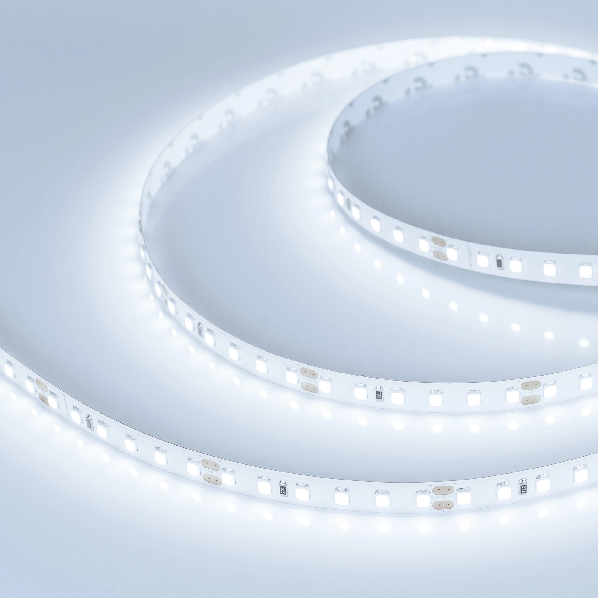 Светодиодная лента шириной 8 мм и мощностью 14.4 Вт/м с индексом цветопередачи CRI>85. Светодиоды SMD 2835 (120 шт/м) холодного белого цвета свечения (8000 К). Напряжение питания 24 В. Минимальный отрезок 50 мм (6 светодиодов). Для декоративной подсветки интерьеров, потолочных ниш, а также подсветки рекламных конструкций и витрин. Обязательна установка на алюминиевый профиль.
