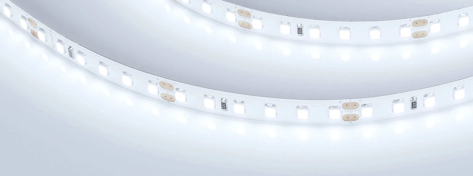 Светодиодная лента шириной 8 мм и мощностью 14.4 Вт/м с индексом цветопередачи CRI>85. Светодиоды SMD 2835 (120 шт/м) белого цвета свечения (6050–6800 К). Напряжение питания 24 В. Минимальный отрезок 50 мм (6 светодиодов). Для декоративной подсветки интерьеров, потолочных ниш, а также подсветки рекламных конструкций и витрин. Обязательна установка на алюминиевый профиль.
