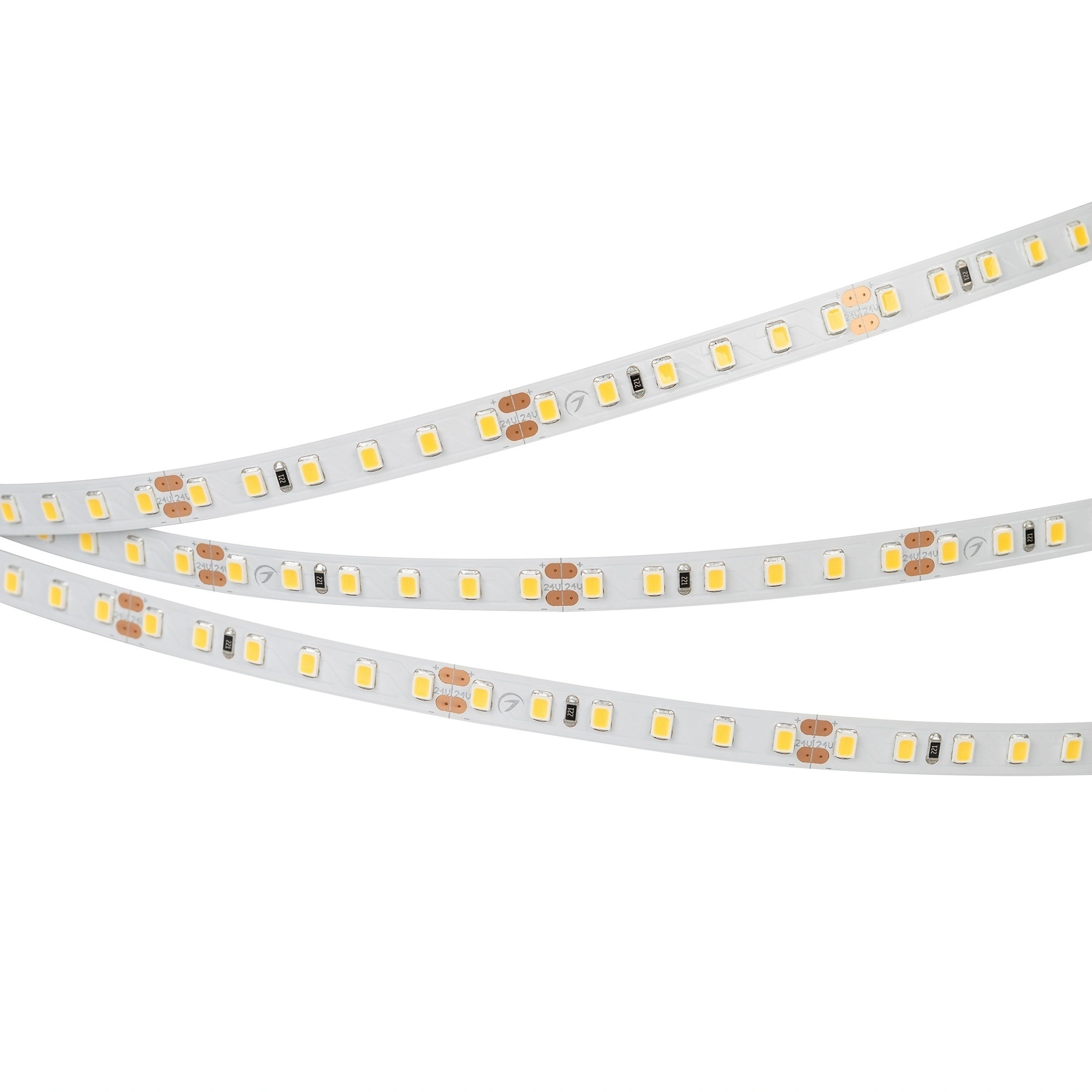 Светодиодная лента шириной 8 мм и мощностью 14.4 Вт/м с индексом цветопередачи CRI>85. Светодиоды SMD 2835 (120 шт/м) теплого белого цвета свечения (3000 К). Напряжение питания 24 В. Минимальный отрезок 50 мм (6 светодиодов). Для декоративной подсветки интерьеров, потолочных ниш, а также подсветки рекламных конструкций и витрин. Обязательна установка на алюминиевый профиль.