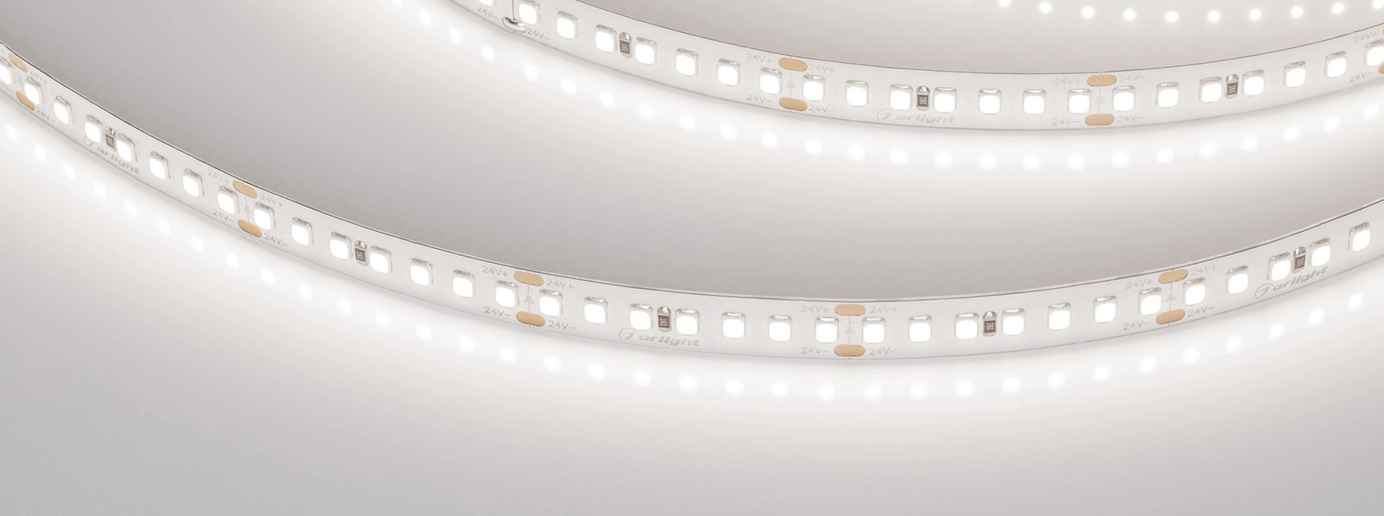 Светодиодная лента UL-A168, открытая. Светодиоды 2835, 168 шт/м (840 шт на 5 м), белая плата, ширина 10 мм, скотч 3M. Цвет ДНЕВНОЙ 5000 K, цветопередача CRI>90, угол 120°. Питание 24V, мощность 17 Вт/м (85 Вт на 5 м). Размеры 5000x10x1.5 мм. Мин. отрезок 41.67 мм, 7 светодиодов. Цена за 1 м.