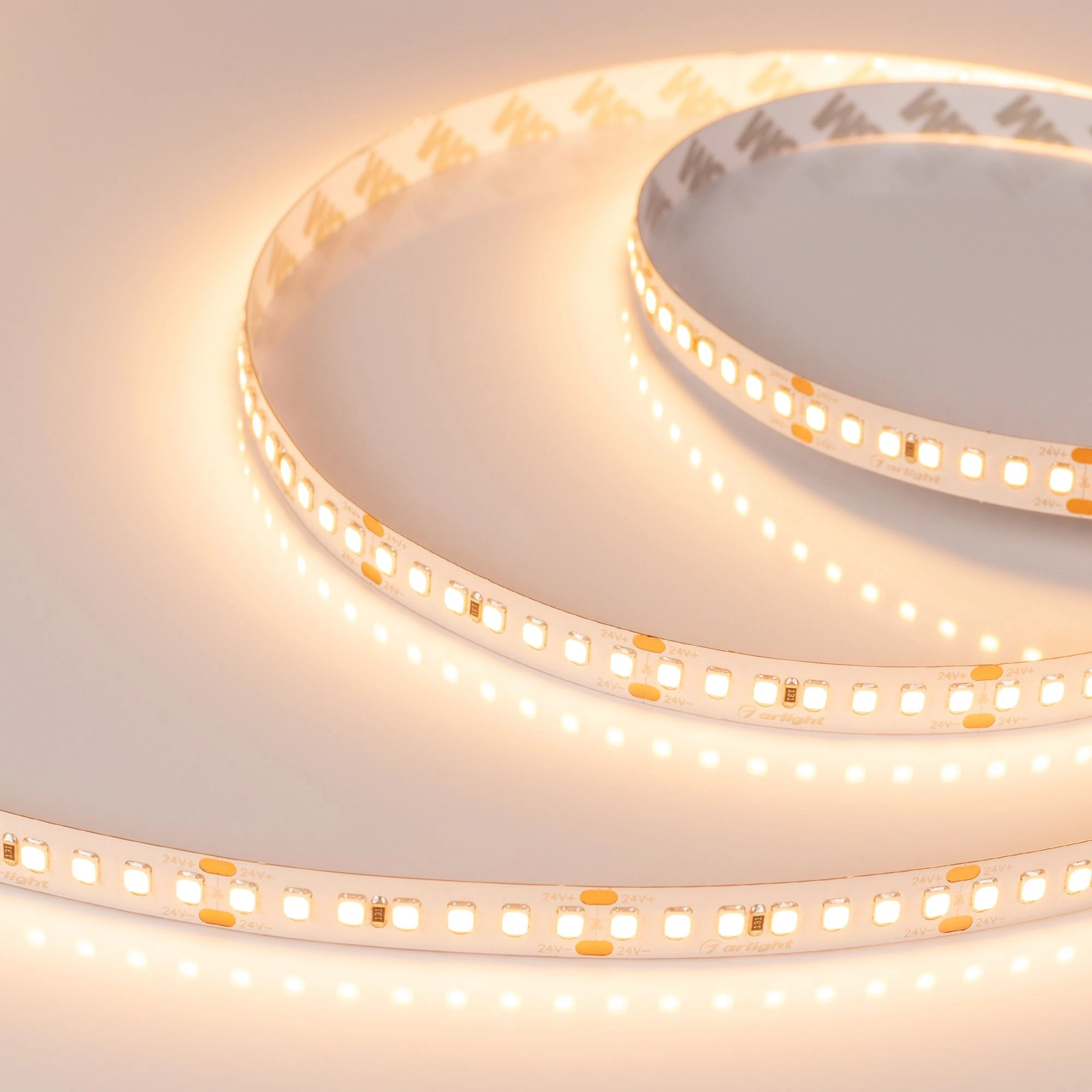 Светодиодная лента RT-A168, открытая. Светодиоды 2835, 168 шт/м (840 шт на 5 м), белая плата, ширина 10 мм, скотч 3M. Цвет ТЁПЛЫЙ 3000 K, цветопередача CRI>85, угол 120°. Питание 24V, мощность 17 Вт/м (85 Вт на 5 м). Размеры 5000x10x1.5 мм. Мин. отрезок 41.67 мм, 7 светодиодов. Цена за 1 м.