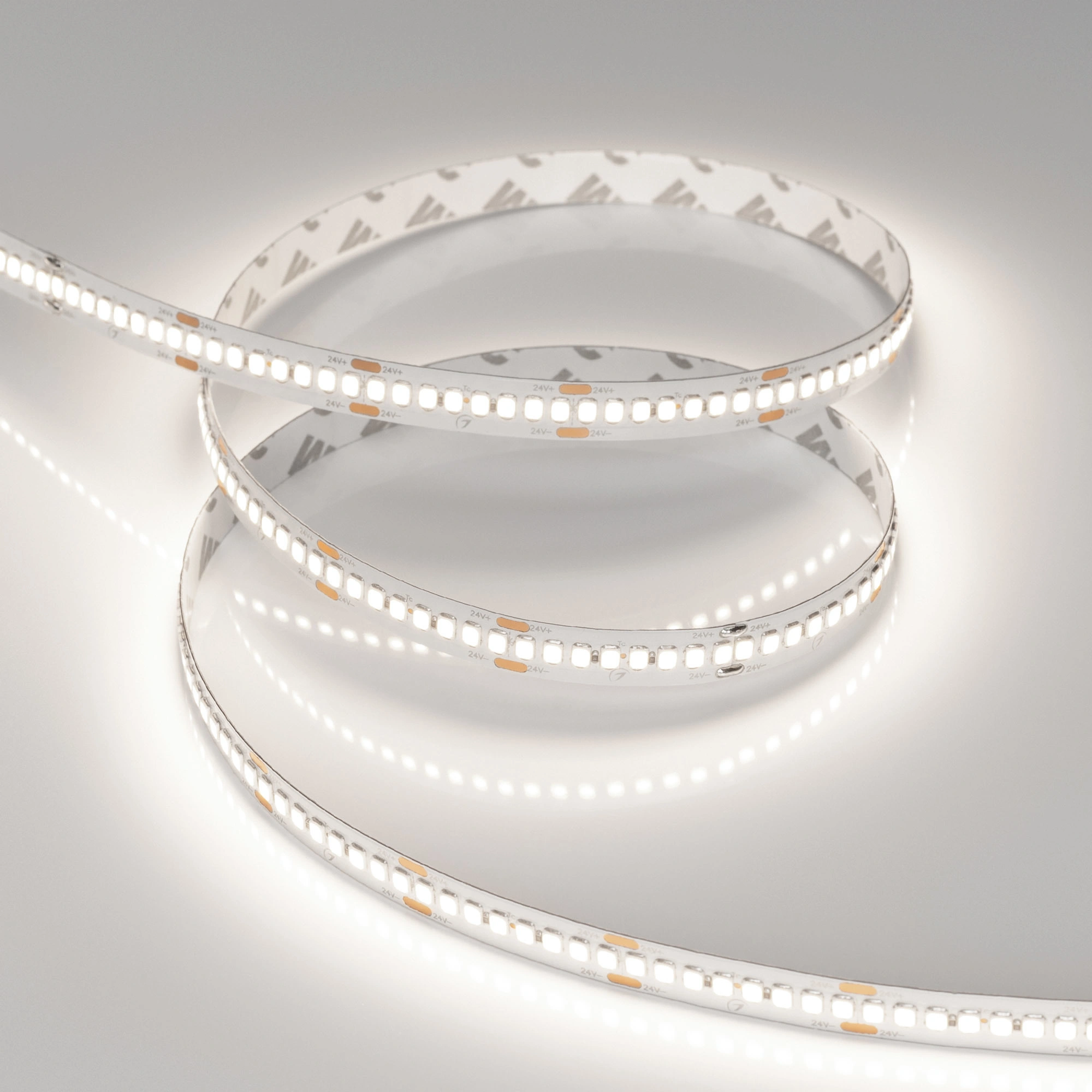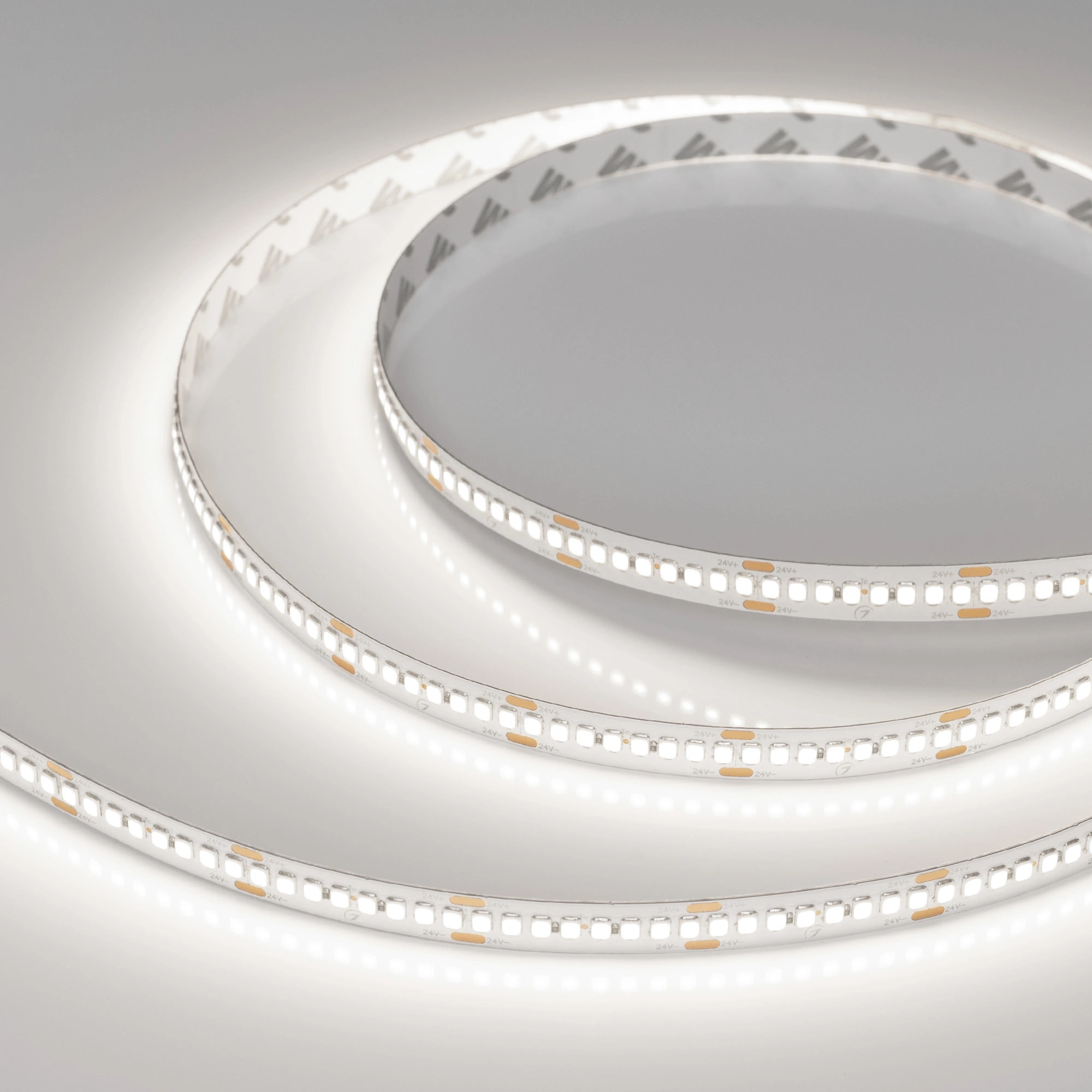 Светодиодная лента RT-A240, открытая. Светодиоды 2835, 240 шт/м (1200 шт на 5 м), белая плата, ширина 10 мм, скотч 3M. Цвет ДНЕВНОЙ 5000 K, цветопередача CRI>85, угол 120°. Питание 24 В, мощность 22 Вт/м (110 Вт на 5 м). Размеры 5000x10x1.6 мм. Мин.отрезок 33.33 мм, 8 светодиодов. Цена за 1 м.